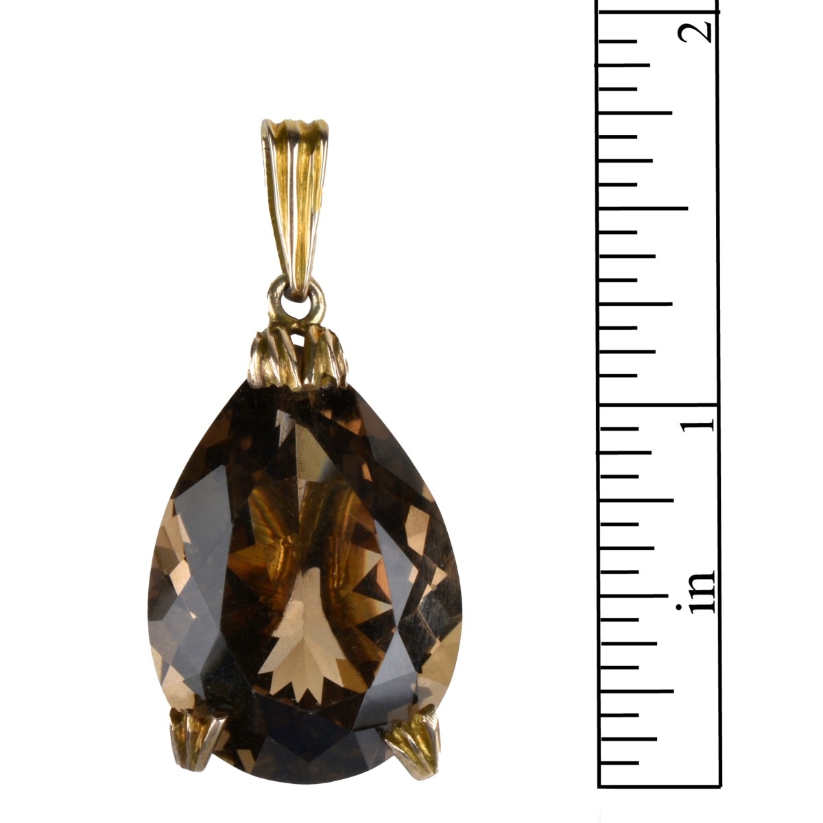 Large Vintage Pear Shape Smokey Quartz and 14 Karat Yellow Gold Pendant. Stamped 14K. Measures 1-3/4" L, 7/8" W. Approx. weight: 12.86 grams. Condition: Very good vintage condition. Estimate: $200.00 - $500.00 Domestic Shipping: $40.00