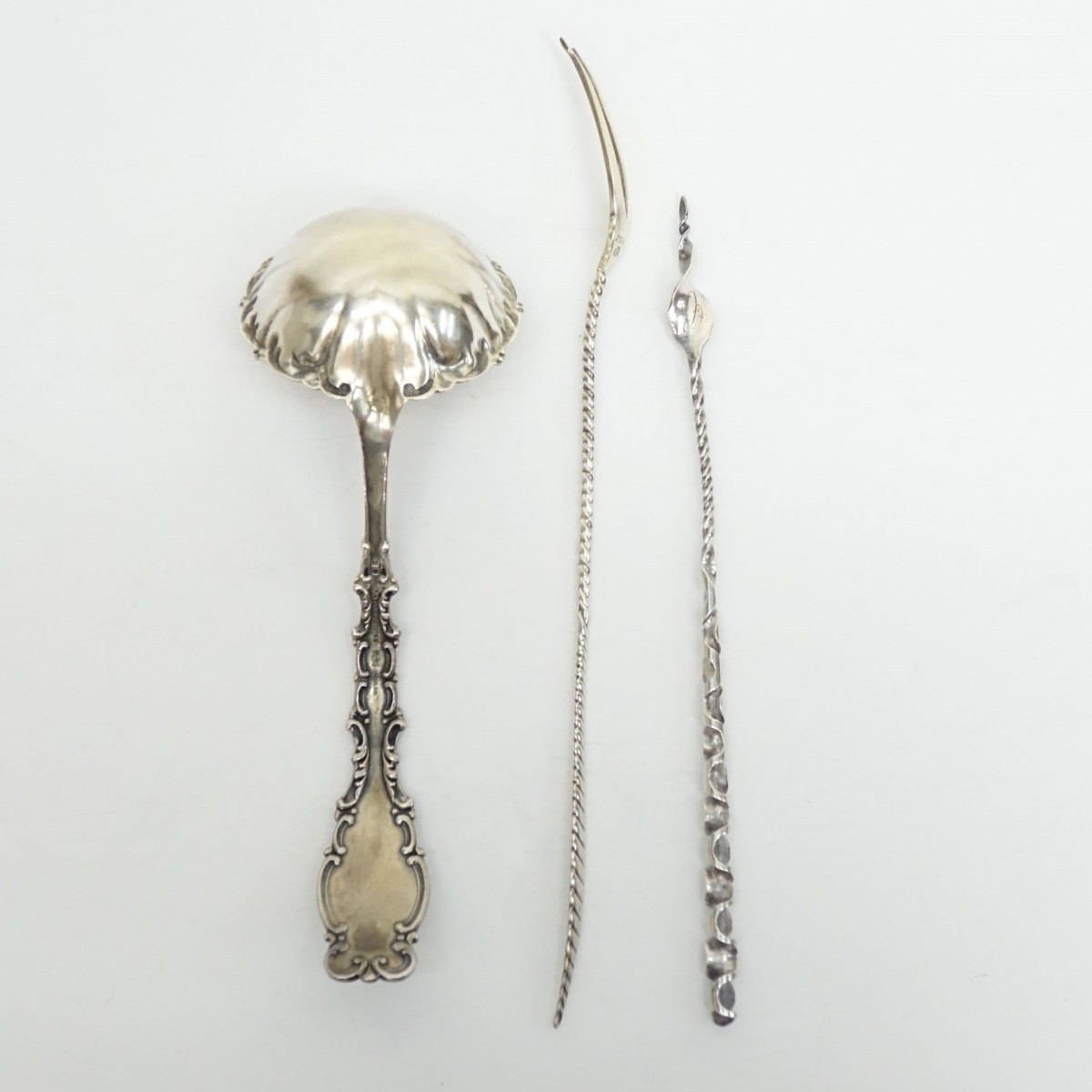 Lot of Three (3) Vintage Sterling Silver Serving Pieces. Includes: Whiting Co ladle with enameled handle, Whiting Co 2-tine fork, and a nut pick. Fork and pick are monogrammed. Pick measures 8-7/8", ladle measures 6-7/8". Approx. weight: 3.12 troy ounces. Condition: Good condition. Estimate: $50.00 - $150.00 Domestic Shipping: $42.00