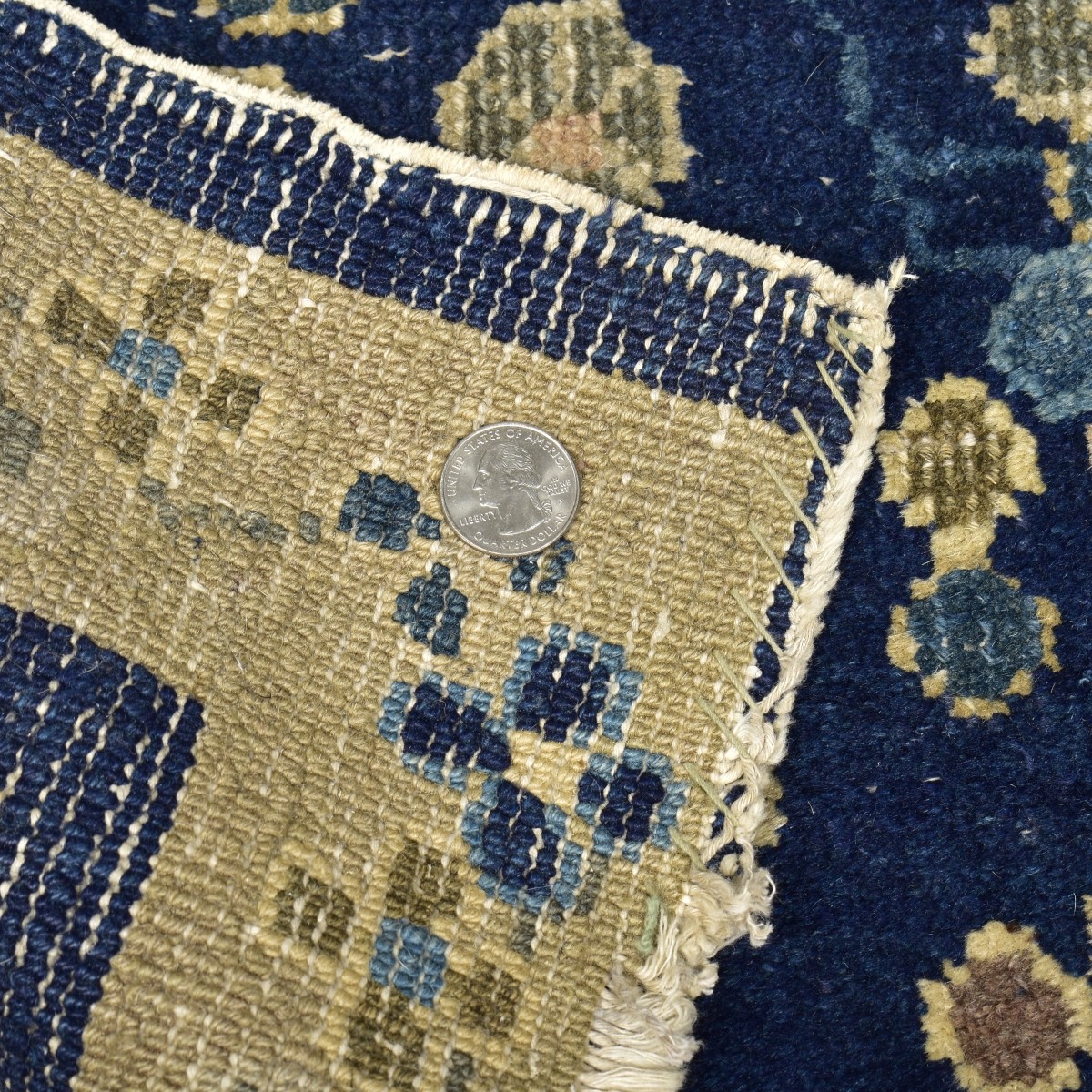 Semi Antique Chinese Art Deco Wool Rug. Floral pattern on blue and tan ground. Measures 45-1/2" x 25". Condition: Wear to the edge, losses to fringes. Needs cleaning. Estimate: $100.00 - $300.00 Domestic Shipping: $88.00