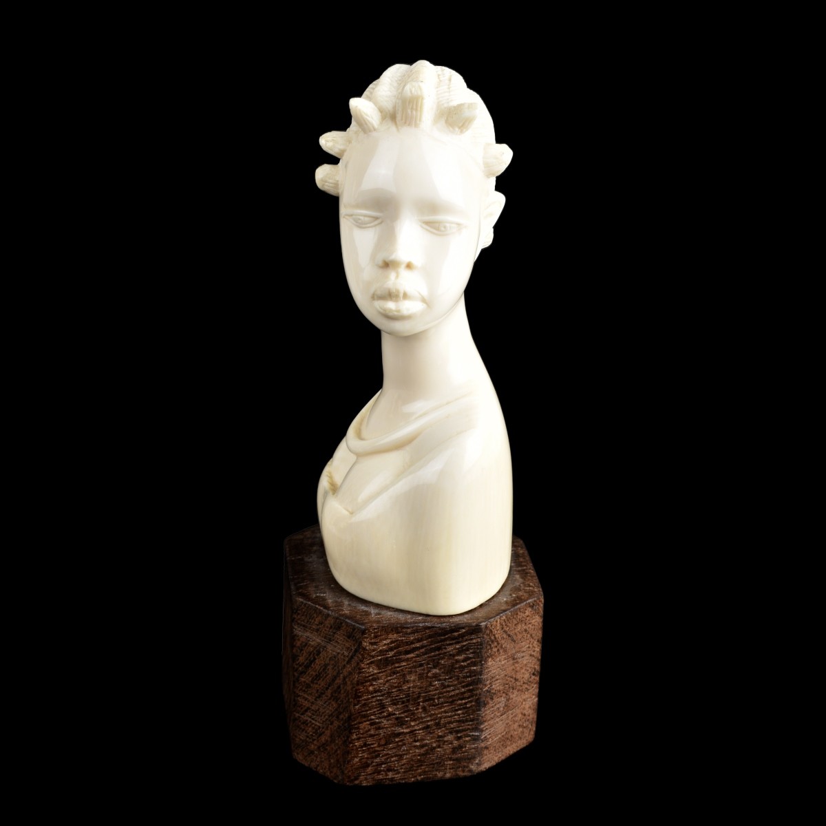 Antique African Carved Bust of Woman Presented on Wooden Base. Overall measures 7-5/8" x 2-3/4" x 2-3/4". We Will Not Ship This Item Out of State of Florida. Anyone Having This Item Shipped Must Have a Florida Address or the Item will not be Shipped. We will Not Knowingly Sell Endangered Species outside of Legal Channels. Condition: Small imperfection on the base of the figurine otherwise good condition. Estimate: $100.00 - $300.00 Domestic Shipping: $58.00