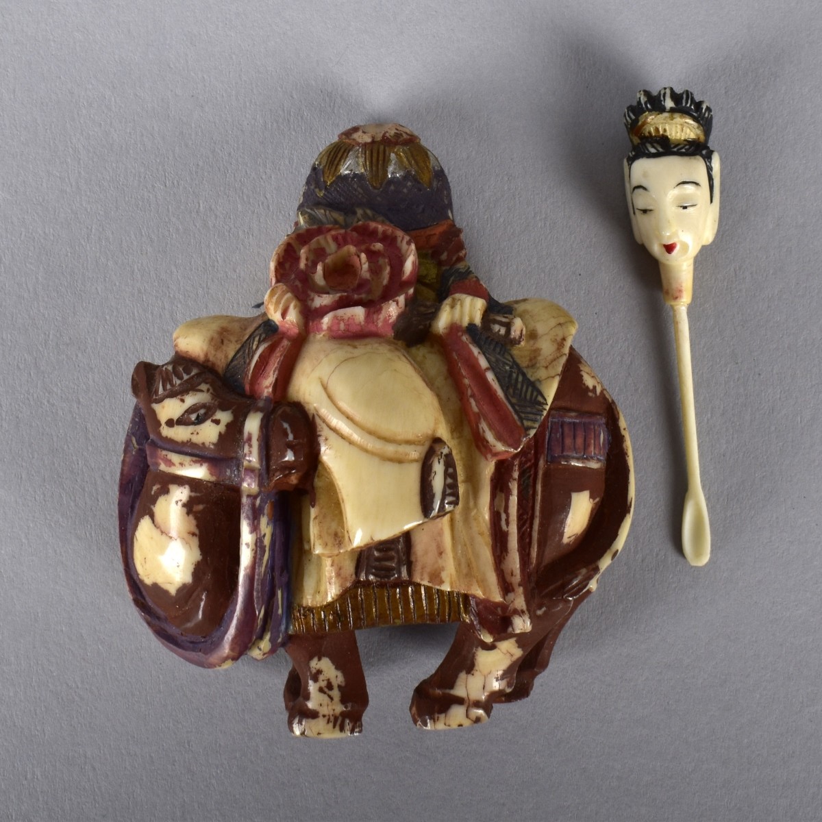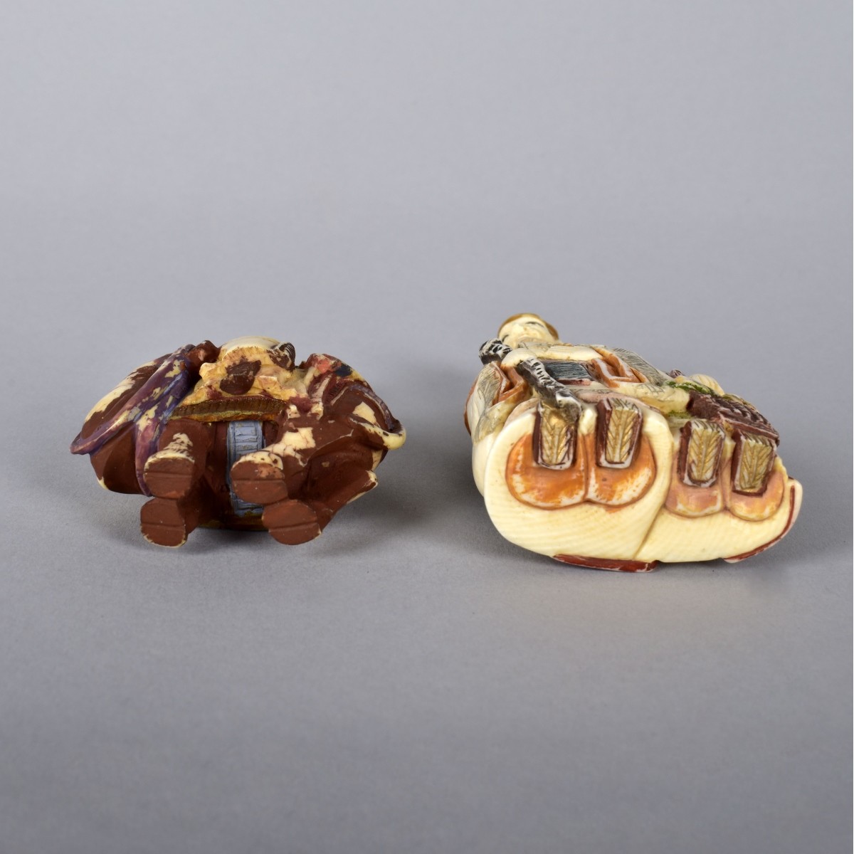 Lot of Two Antique Japanese Polychrome Painted Carved Figural Snuff Bottles. Unsigned. Two figural group measures 3-1/2" x 1-3/4". Remaining figurine measures 3" x 2". We Will Not Ship This Item Out of State of Florida. Anyone Having This Item Shipped Must Have a Florida Address or the Item will not be Shipped. We will Not Knowingly Sell Endangered Species outside of Legal Channels. Condition: Rubbing to the surface otherwise good condition. Estimate: $100.00 - $300.00 Domestic Shipping: $40.00