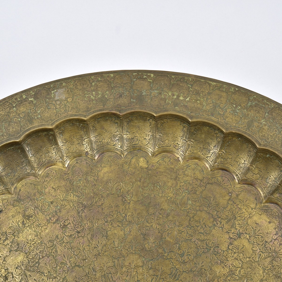 Large Indian Etched Scalloped Brass Charger. Measures 40-1/4" diam. Condition: Good condition. Estimate: $150.00 - $250.00 Domestic Shipping: Third party
