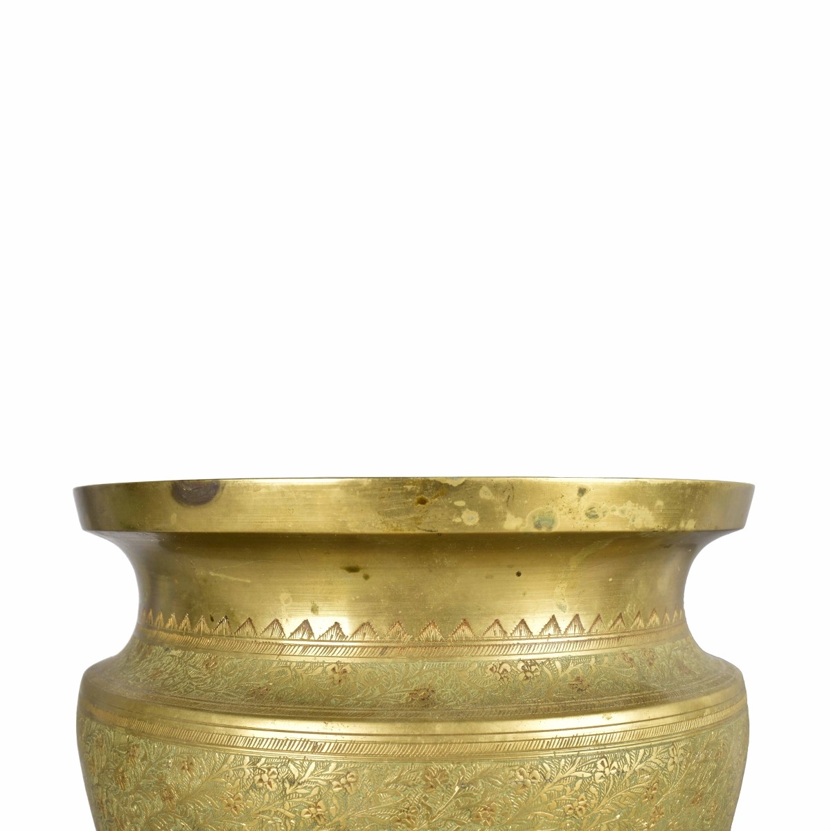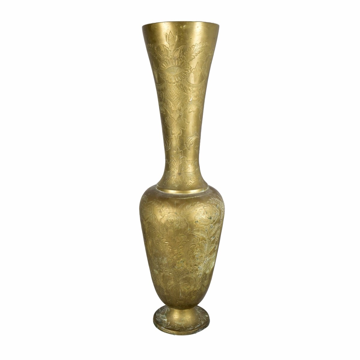 Grouping of Three Vintage Etched Brass Items. Include a pair of large vases together with a lidded basket. Vases measure 22" x 6". Basket measures 10-8-1/8". Condition: Vases has some dings otherwise good condition. Estimate: $100.00 - $150.00 Domestic Shipping: Third party
