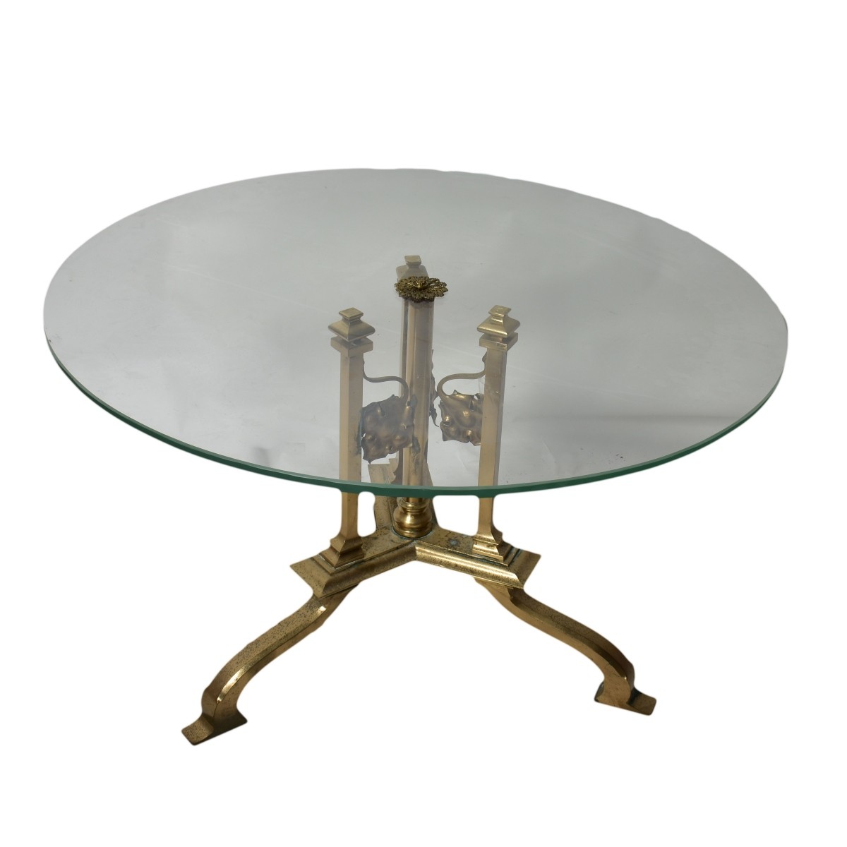 Mid Century Neoclassical Style Gilt Metal Glass Top Table. Base measures 21" x 25-1/2". Glass measures 35-1/4" diam. Condition: Oxidation tot the base. Estimate: $200.00 - $400.00 Domestic Shipping: Third party