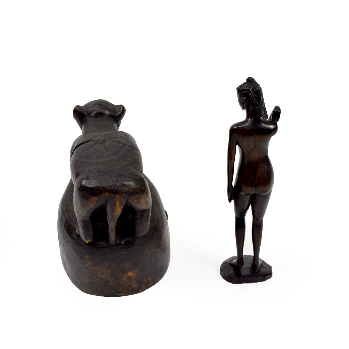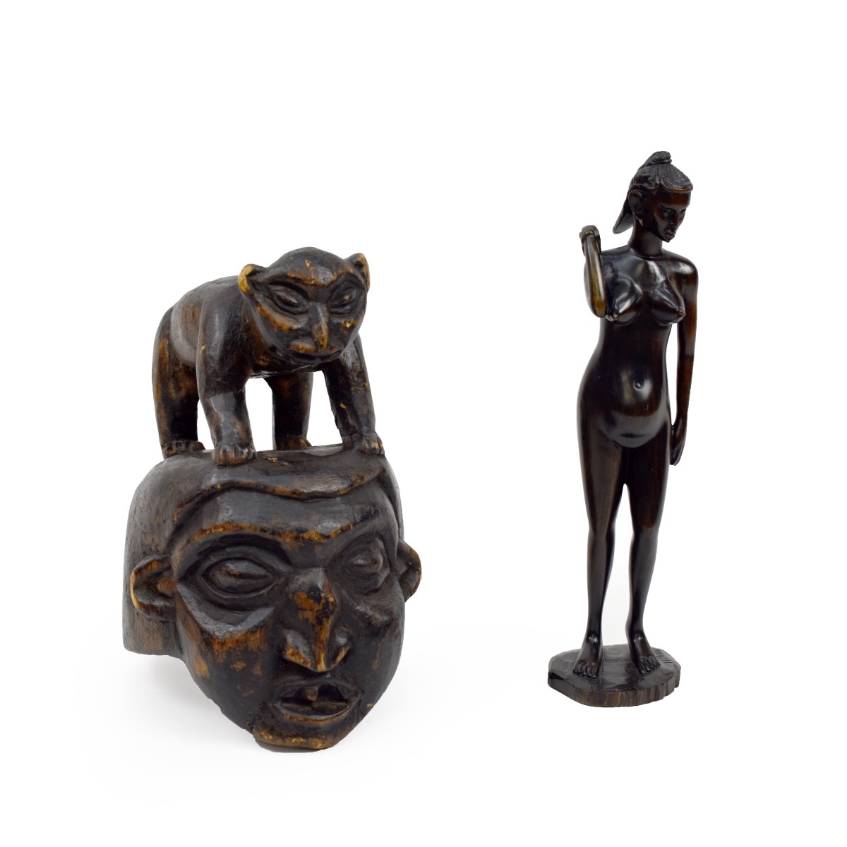 20th Century Hand Carved Signed African Wood Carved Nude together with a Sculpture Head with Figural Animal on Top. Head measures 14-3/4" x 9" x 9-1/2". Nude measures 17-1/8" x 4-3/8". Condition: Head has some scratches and scuffs otherwise good condition. Estimate: $40.00 - $100.00 Domestic Shipping: Third party