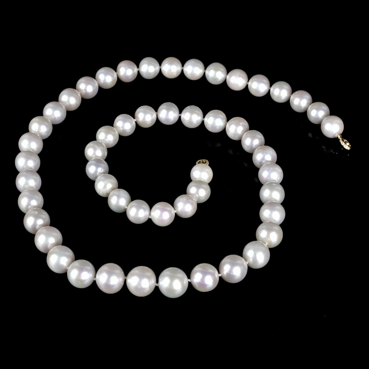 Single Strand 12.0-15.0mm South Sea Pearl Necklace with Diamond and 18 Karat Yellow Gold Clasp. Pearls with good luster and polish, minor natural blemishes. Measures 32" L. Approx. total weight: 163.48 grams. Condition: Very good condition. For additional information and/or WhatsApp video please contact our resident GIA Graduate Gemologist, Russ Kodner at 954.650.5030 Estimate: $4000.00 - $6000.00 Domestic Shipping: $40.00