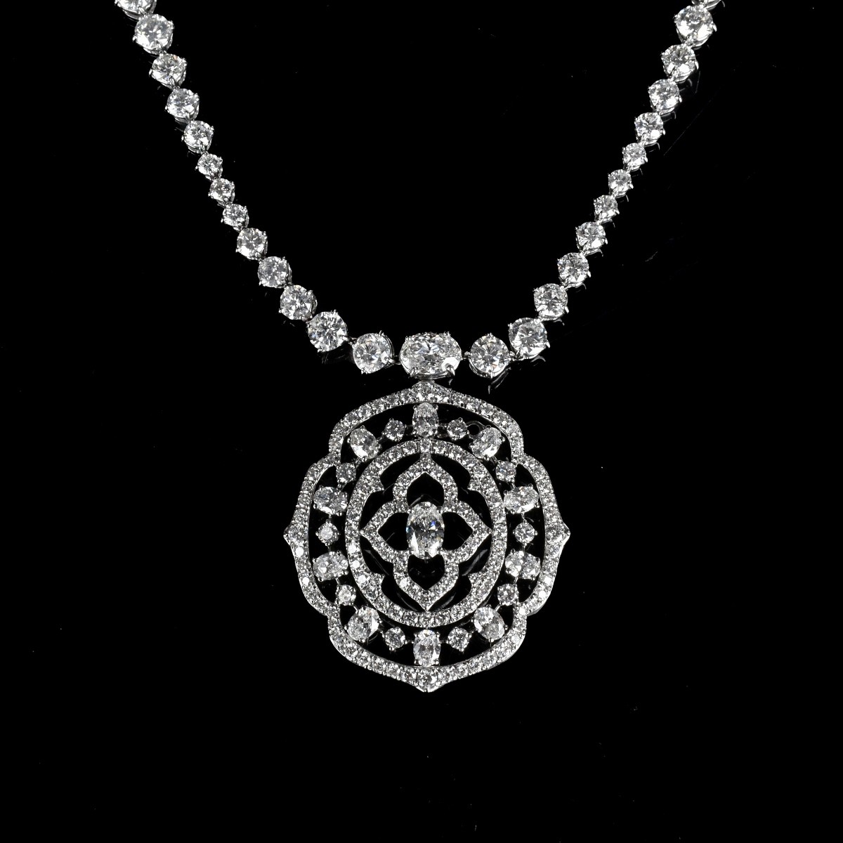 Very Fine Italian Piranesi Diamond and 18 Karat White Gold Necklace with Detachable Pendant. The necklace is set with 16.0 carats TW oval brilliant and round brilliant cut diamonds, D-E color, VVS-VS clarity. The three largest oval cuts weighting approx. 1.0 carat each. The pendant is set with 5.66 carats TW oval brilliant and round brilliant cut diamonds, D-E color, VVS-VS clarity. Clasp signed and stamped Made in Italy 750. Pendant is signed, stamped 750. Necklace measures 16-1/4" L; pendant measures 1-1/2" H, 1-3/8" W. Approx. total weight: 31.03 grams. Purchased from Saks Fifth Avenue, New York and accompanied by Piranesi receipts reflecting $111,100.00 total purchase price for the two pieces. Condition: Very good condition. For additional information and/or WhatsApp video please contact our resident GIA Graduate Gemologist, Russ Kodner at 954.650.5030 Estimate: $40,000.00 - $60,000.00 Domestic Shipping: $42.00