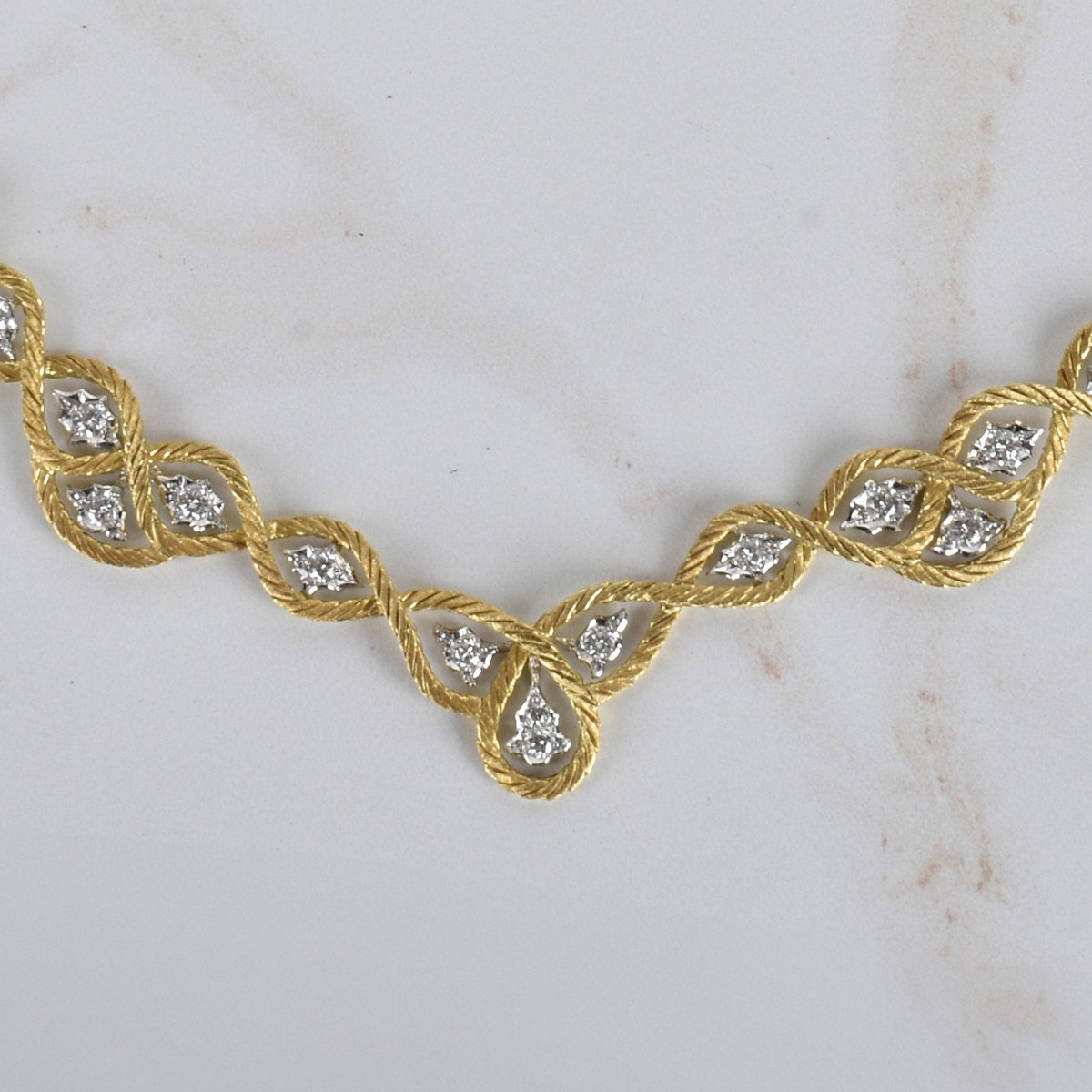 Vintage Italian Buccellati Diamond and 18 Karat Yellow and White Gold Necklace and Detachable Pendant Drop Earrings. Set throughout with numerous round brilliant cut diamonds, D-E color, VS clarity. Signed, stamped Italy 18K, 750 and Italian hallmark. Necklace measures 16" L (7/8" L top section only); earrings measure 2-1/8" L (7/8" L top section only), 9/16"W. Approx. total weight: 62.42 grams. Condition: Very good condition. For additional information and/or WhatsApp video please contact our resident GIA Graduate Gemologist, Russ Kodner at 954.650.5030 Estimate: $30,000.00 - $40,000.00 Domestic Shipping: $42.00