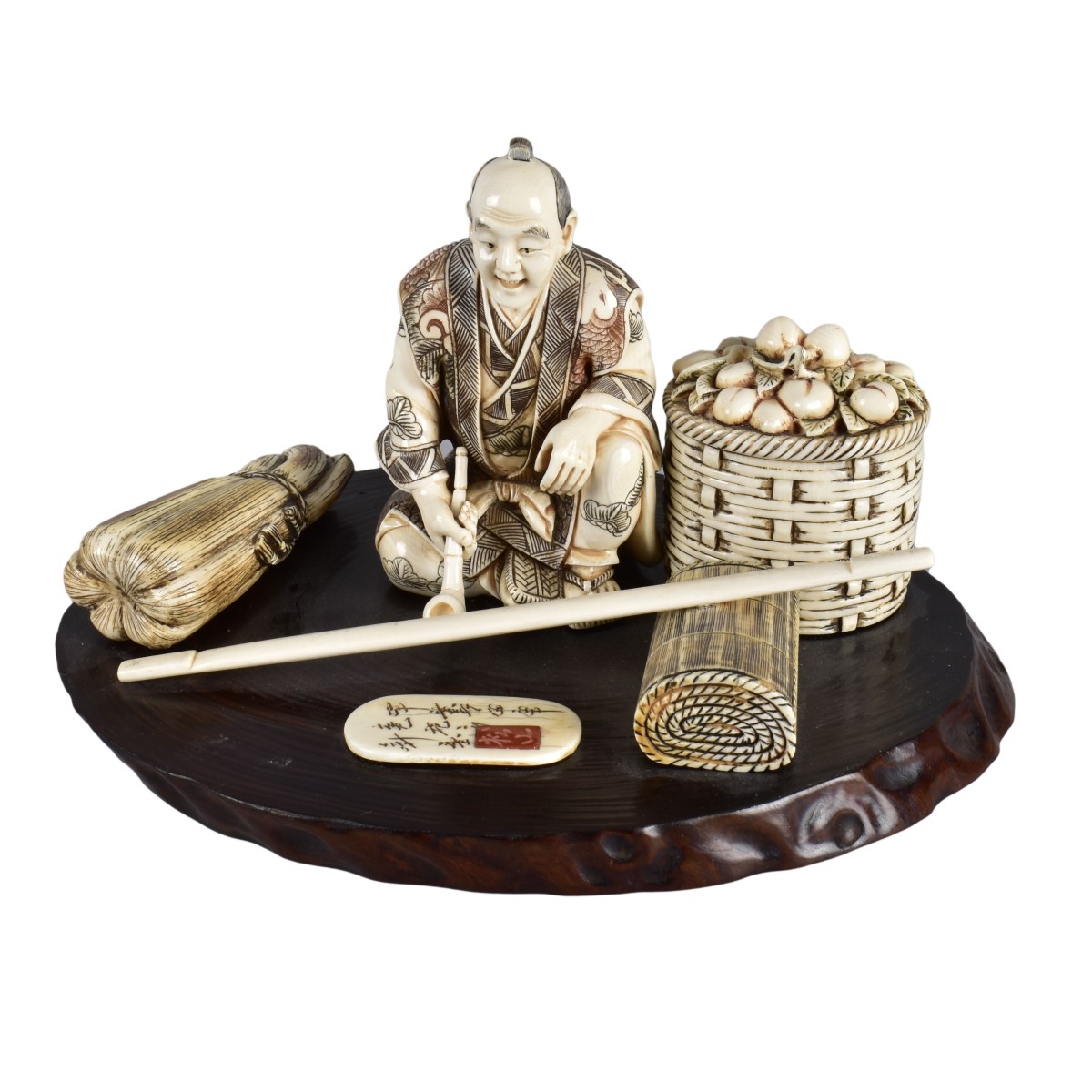 Antique Japanese Polychrome Carved Figurine Presented on a Wooden Stand. Signed. Depicts a figurine with objects. Overall measures 6" x 9" x 7". We Will Not Ship This Item Out of State of Florida. Anyone Having This Item Shipped Must Have a Florida Address or the Item will not be Shipped. We will Not Knowingly Sell Endangered Species outside of Legal Channels. Condition: Good condition. Estimate: $400.00 - $600.00 Domestic Shipping: $75.00