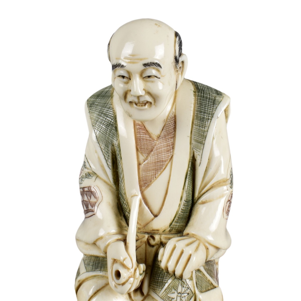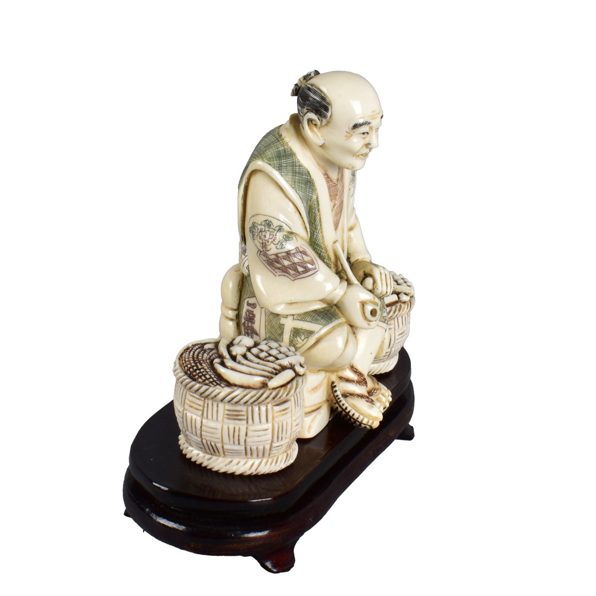 Antique Japanese Polychrome Carved Figurine of a Fruit Seller Presented on a Wooden Base. Signed. Original sticker price attached to the base. Figurine Measures 4" x 4-1/4" x 2-1/8". We Will Not Ship This Item Out of State of Florida. Anyone Having This Item Shipped Must Have a Florida Address or the Item will not be Shipped. We will Not Knowingly Sell Endangered Species outside of Legal Channels Condition: Good condition. Estimate: $200.00 - $400.00 Domestic Shipping: $50.00