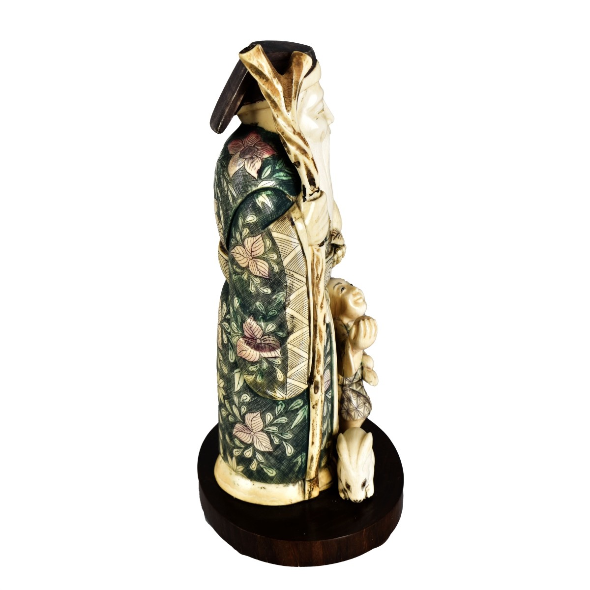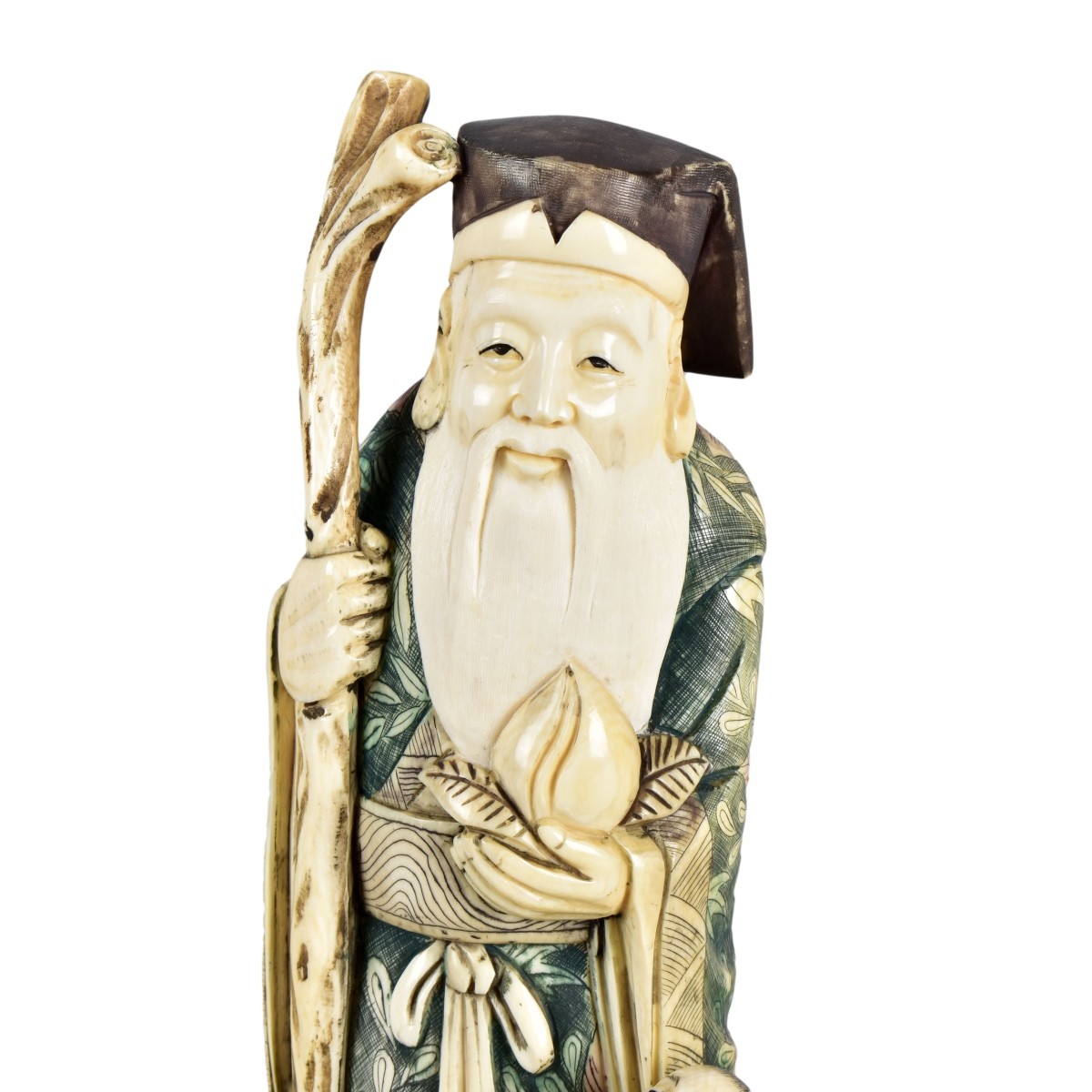 Antique Japanese Polychrome Carved Shou Lao Figural Group. Signed. Figurine measures 7-7/8" x 2-3/4" (w/o base). Overall measures 9" x 4-1/4" x 3-3/4". 1/8". We Will Not Ship This Item Out of State of Florida. Anyone Having This Item Shipped Must Have a Florida Address or the Item will not be Shipped. We will Not Knowingly Sell Endangered Species outside of Legal Channels Condition: Good condition. Estimate: $300.00 - $500.00 Domestic Shipping: $66.00