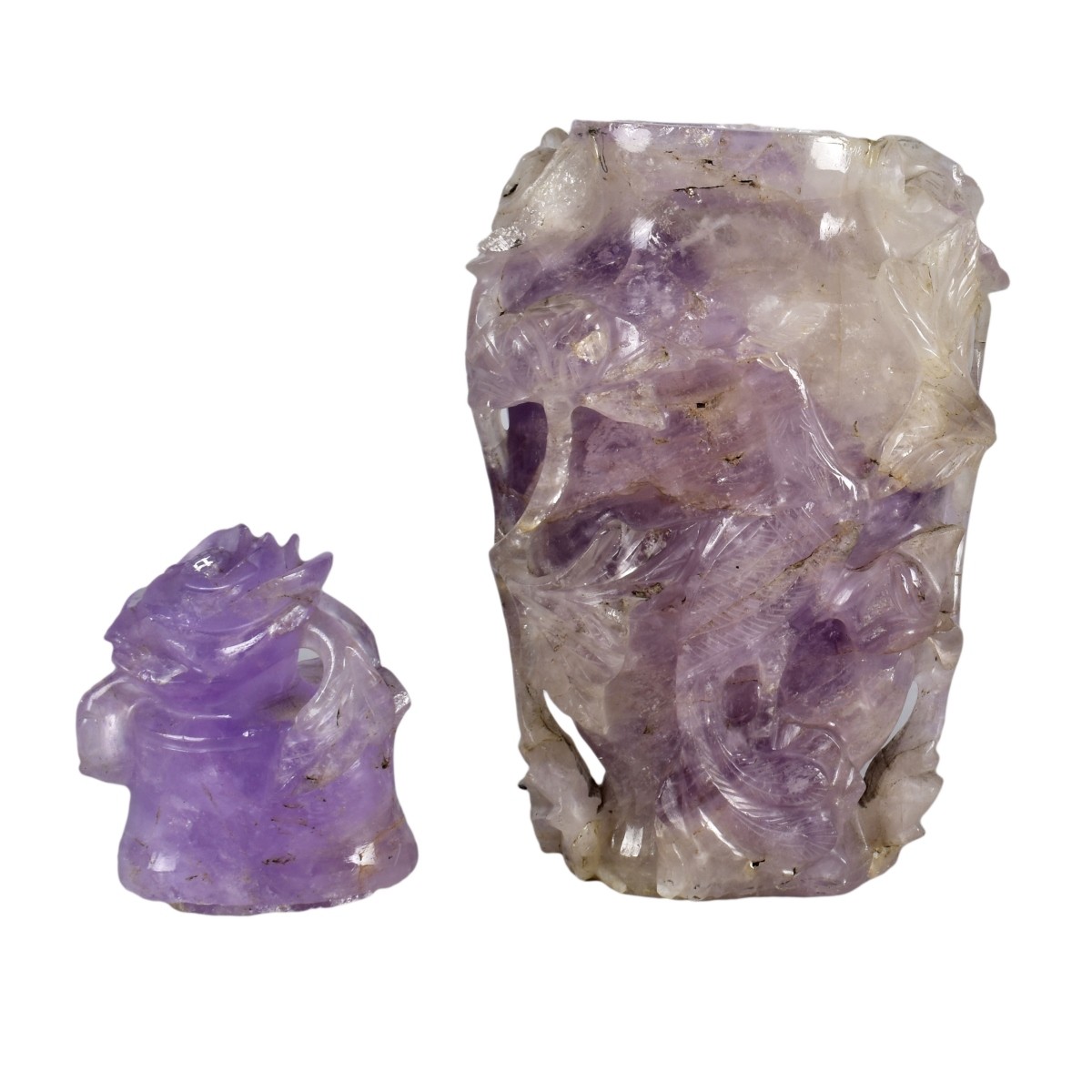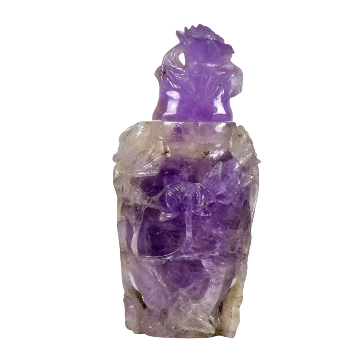 Antique Chinese Carved Lavender Jade Lidded Vase. Floral and bird relief. Measures 5-1/4" x 2-1/2". Condition: Nicks and small losses to the surface. Estimate: $200.00 - $300.00 Domestic Shipping: $55.00