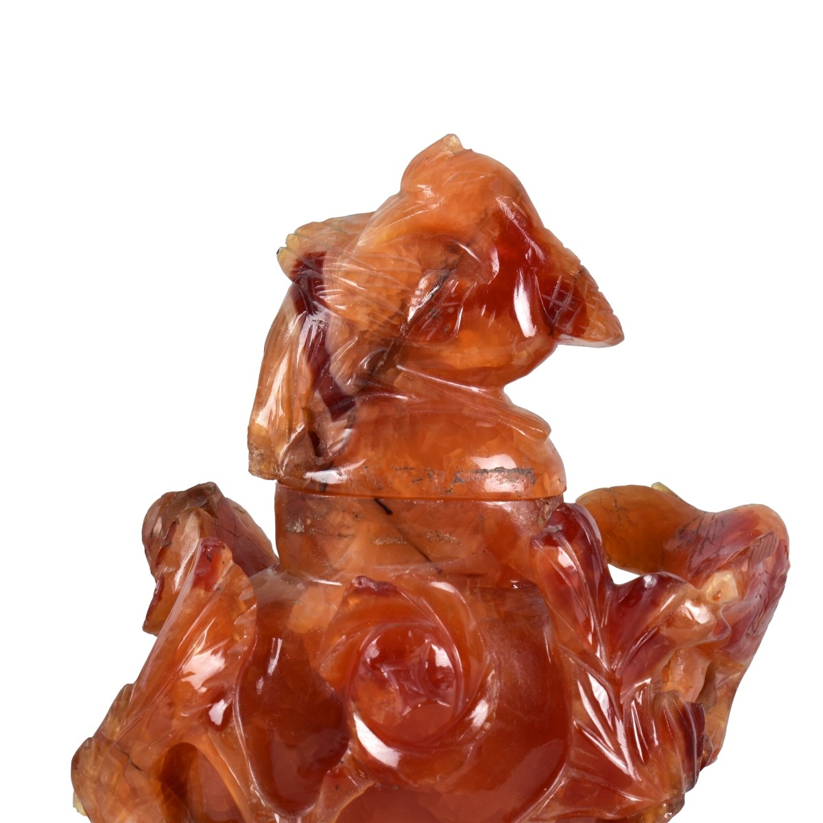 Antique Chinese Carved Agate Lidded Vase Presented on a Wooden Stand. Vase measures 5-1/8" x 4" x 2". Overall height: 6-1/4". Condition: Bird cover has some small losses otherwise good condition. Estimate: $200.00 - $400.00 Domestic Shipping: $58.00