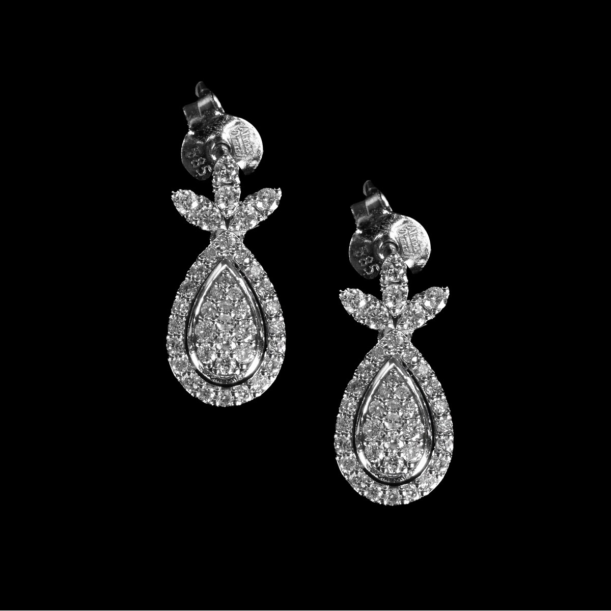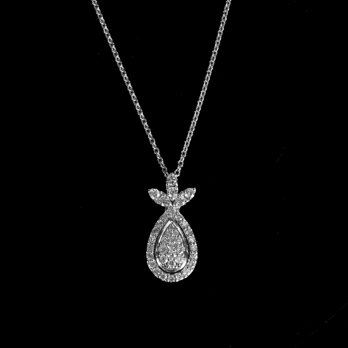 Approx. .80 Carat TW Round Brilliant Cut Diamond and 14 Karat White Gold Pendant Necklace and Earrings Suite. Diamonds G color, SI clarity. Pendant measures 9/16" L, 1/4" W; chain measures 16-1/2 L. Earrings measure 9/16" L, 1/4" W. Approx. total weight: 5.33 grams. Condition: New condition. For additional information and/or WhatsApp video please contact our resident GIA Graduate Gemologist, Russ Kodner at 954.650.5030 Estimate: $700.00 - $900.00 Domestic Shipping: $40.00