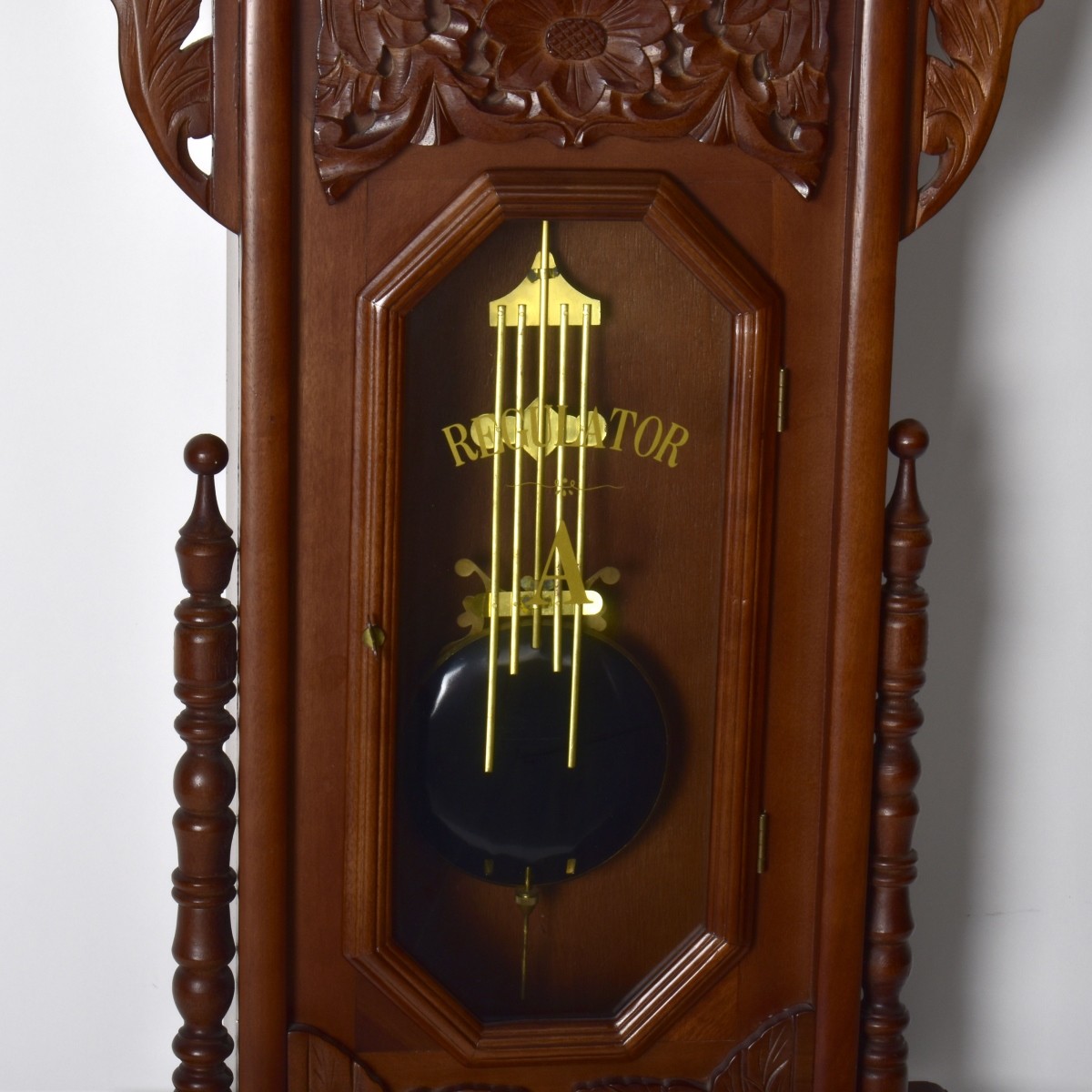Large Regulator Wall Clock in Carved Wooden Case. Key and pendulum to accompany the lot. Measures 49" x 20-1/2". Please note the gallery does not warranty the running condition of clocks. Condition: Good condition. Estimate: $100.00 - $200.00 Domestic Shipping: Third party