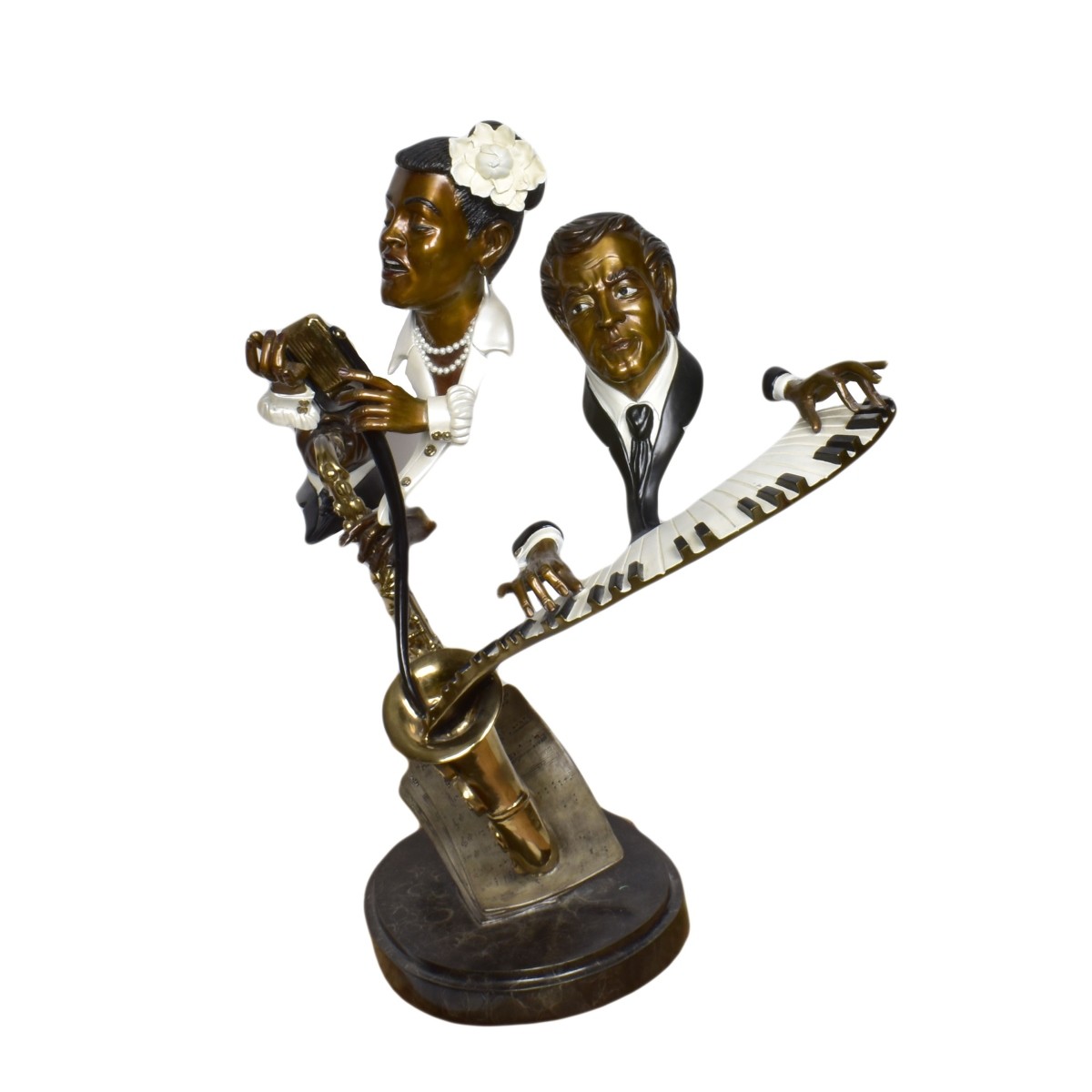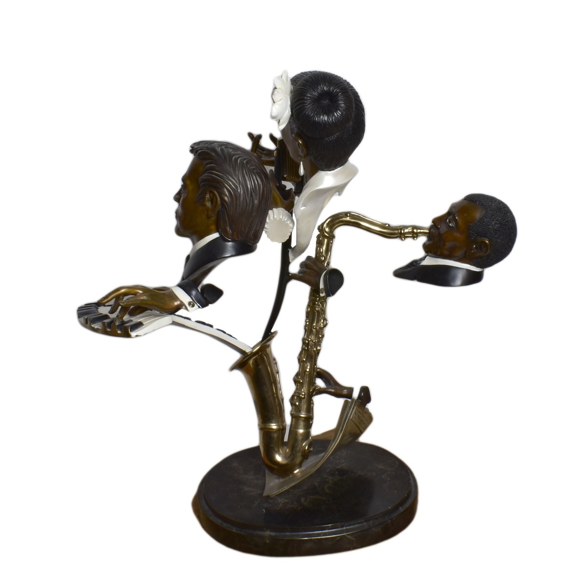 Paul Wegner, American (b. 1950) 1995 Cold Painted and Patinated Bronze Sculpture, "Lady Day", Signed in cast, Edition of 175. Published by Dyansen Studio. Depicting Billie Holiday singing with saxophone player and pianist on marble base. Measures 27-1/2" H (plus 2-1/2" H base) 28" W, 18" D. Condition: Very good condition. Estimate: $2400.00 - $4000.00 Domestic Shipping: Third party