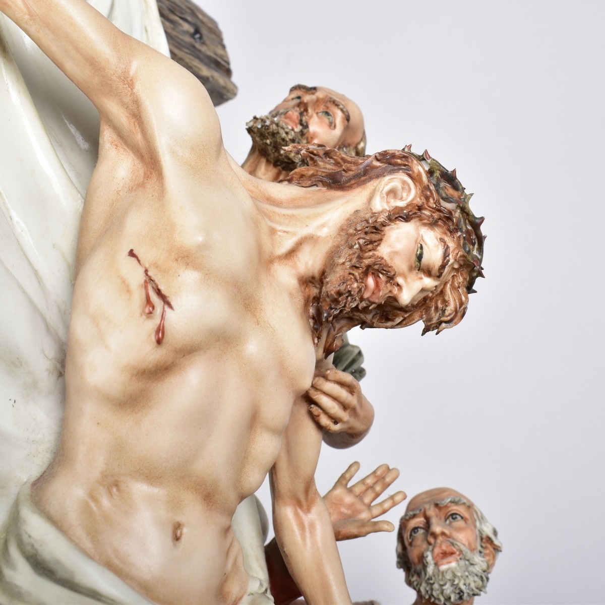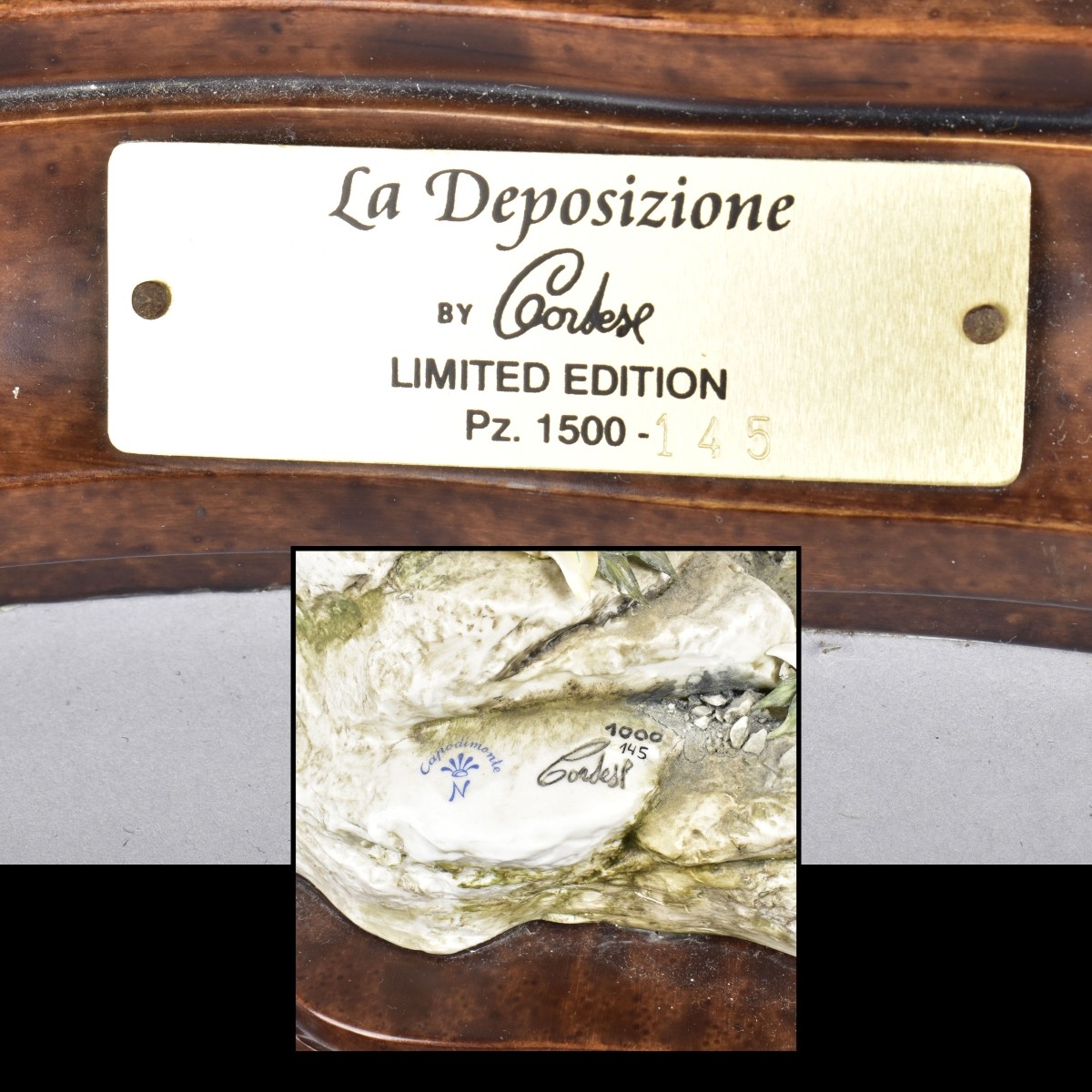 Palace Size Limited Edition Capodimonte "La Deposizione" Porcelain Figural Group By Cortese Presented on a Wooden Base. Signed and numbered 145/1000. Measures 29" x 19-1/2" x 16". Condition: Small loss to one finger otherwise good condition. Estimate: $1000.00 - $1500.00 Domestic Shipping: Third party