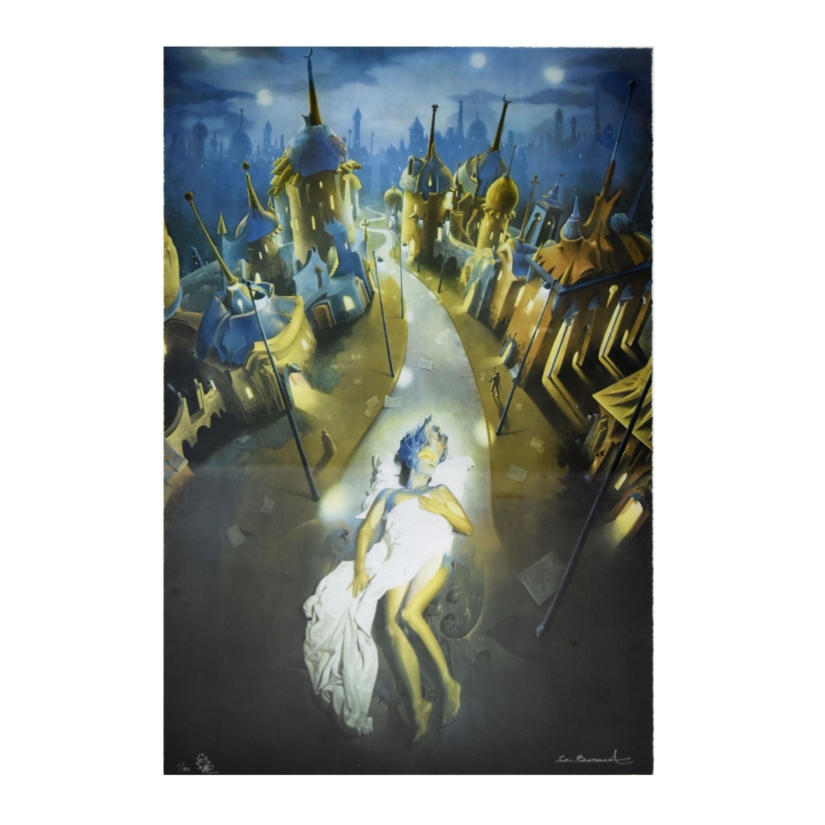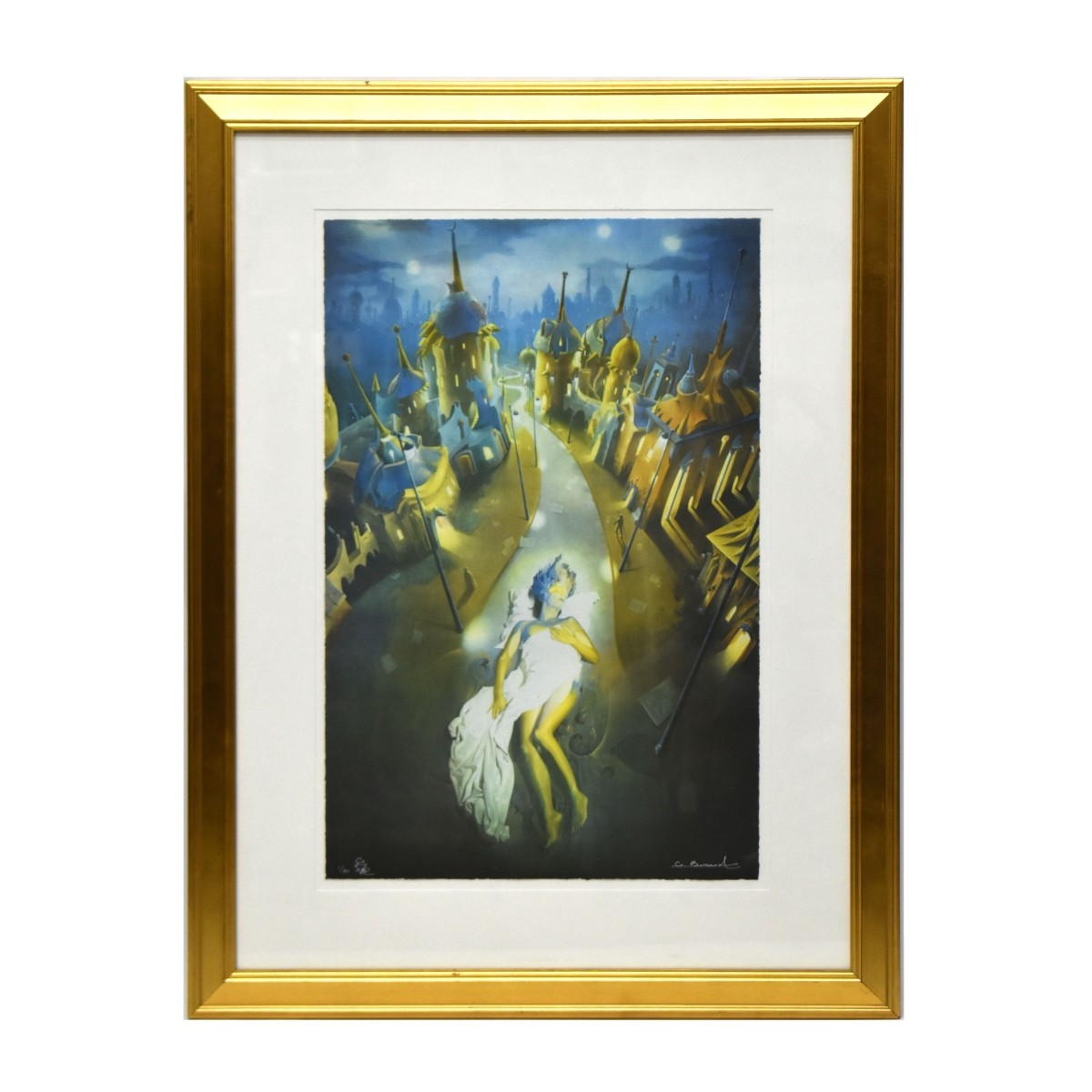 Gil Bruvel, Australian (Born 1959) Color Lithograph on Paper "Surrealist Figurative Scene" Signed and Numbered 1/30. Artist emblem lower left. Sight measures 29-1/4" x 19-3/8". Frame measures 41-5/8" x 32-1/8". Condition: Good condition. Estimate: $200.00 - $600.00 Domestic Shipping: Third party