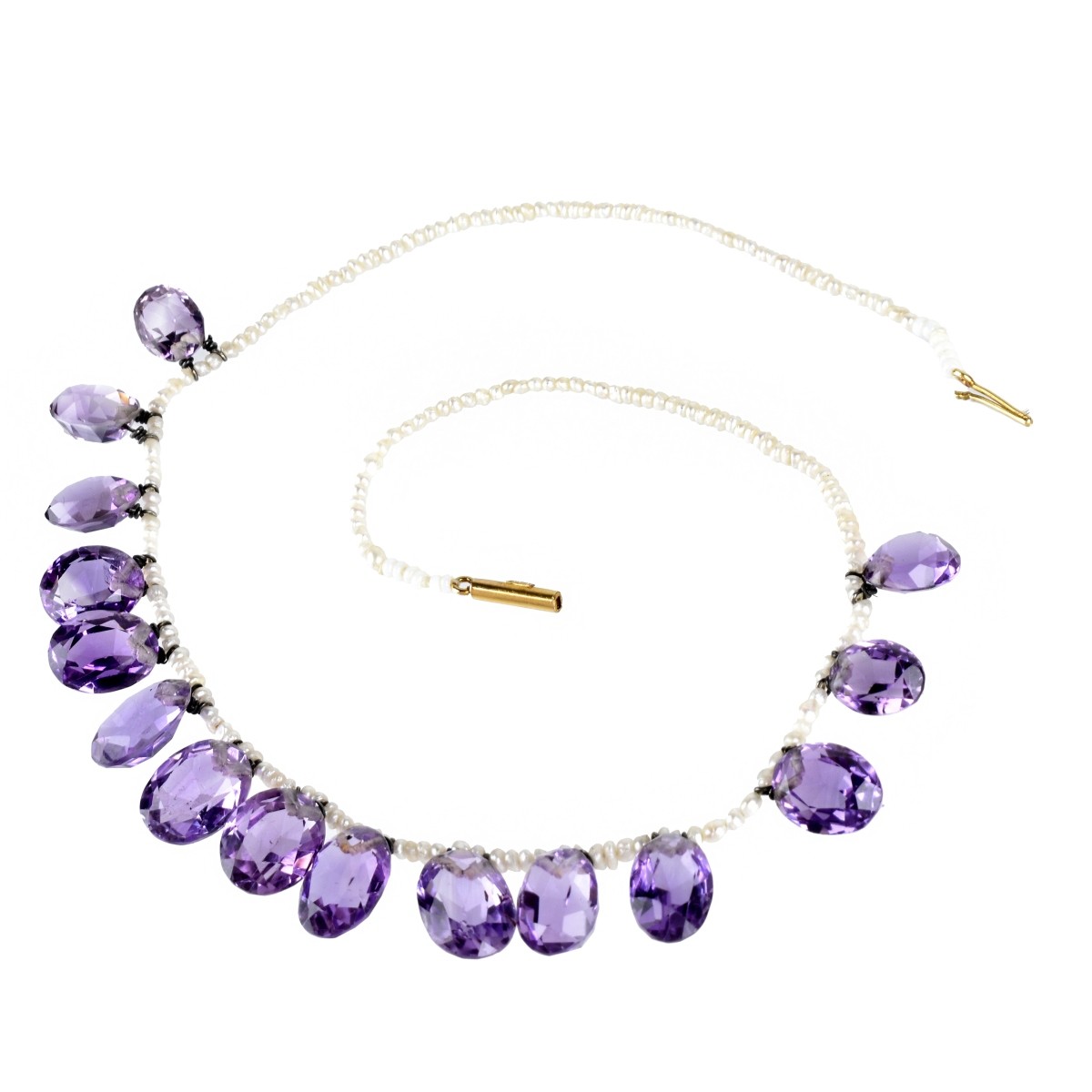 Antique Fifteen Graduated Oval Cut Amethyst and Seed Pearl Necklace with 15 Karat Yellow Gold Clasp. Amethysts with good color and clarity. Clasp stamped 15K. Measures 14-1/4" L. Approx. weight: 14.73 grams. Condition: Very good antique condition. For additional information and/or WhatsApp video please contact our resident GIA Graduate Gemologist, Russ Kodner at 954.650.5030 Estimate: $500.00 - $700.00 Domestic Shipping: $40.00