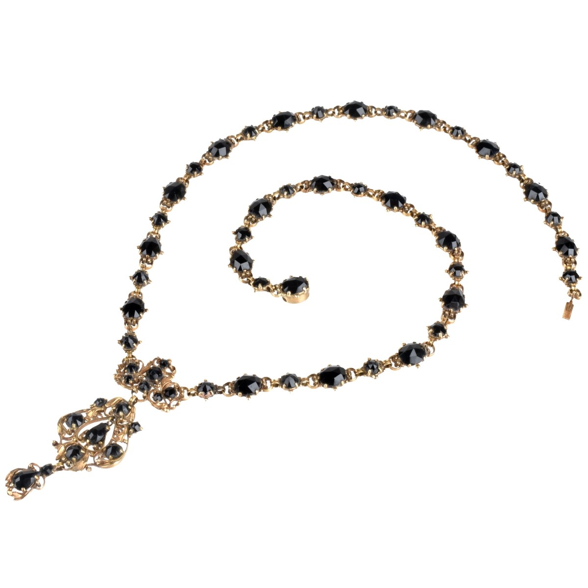 Antique Victorian Faceted Jet and 14 Karat Yellow Gold Pendant Necklace. Clasp stamped 585. Measures 17" L, 2" drop. Approx. weight: 20.47 grams. Condition: Good antique condition. Clasp needs small repair. Estimate: $600.00 - $800.00 Domestic Shipping: $40.00