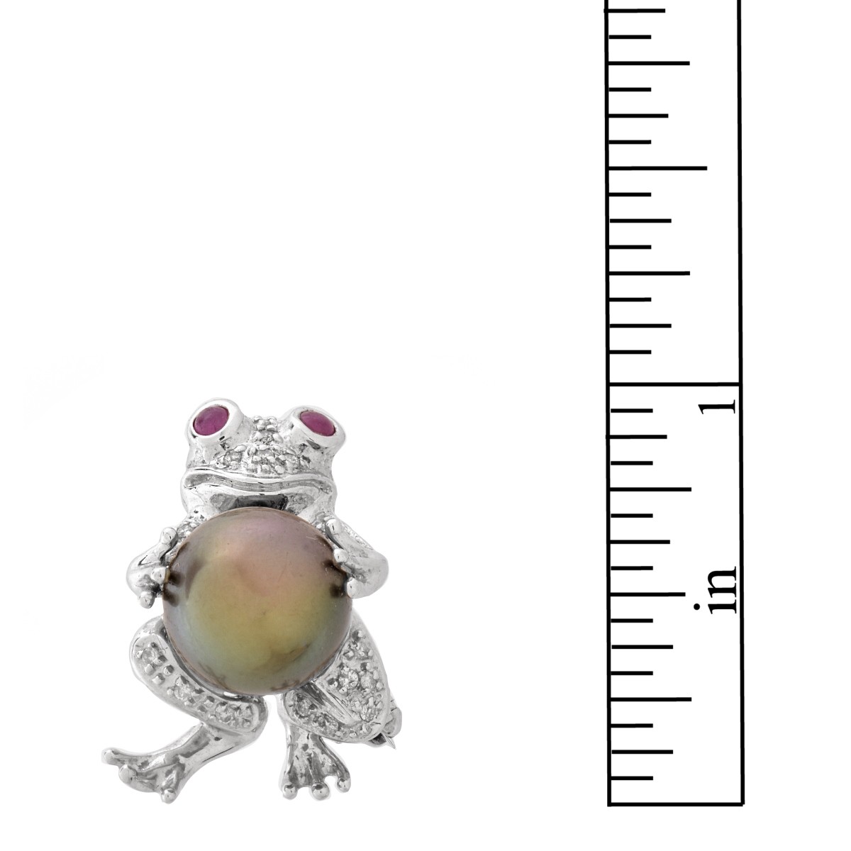 Vintage 11.0mm Tahitian Black Pearl, Pave Set Diamond and 18 Karat White Gold Frog Brooch Set with Cabochon Ruby Eyes. Pearl with good luster and polish. Stamped 18K. Measures 1" H, 3/4" W. Approx. weight: 8.44 grams. Condition: Very good condition. Estimate: $500.00 - $1000.00 Domestic Shipping: $28.00