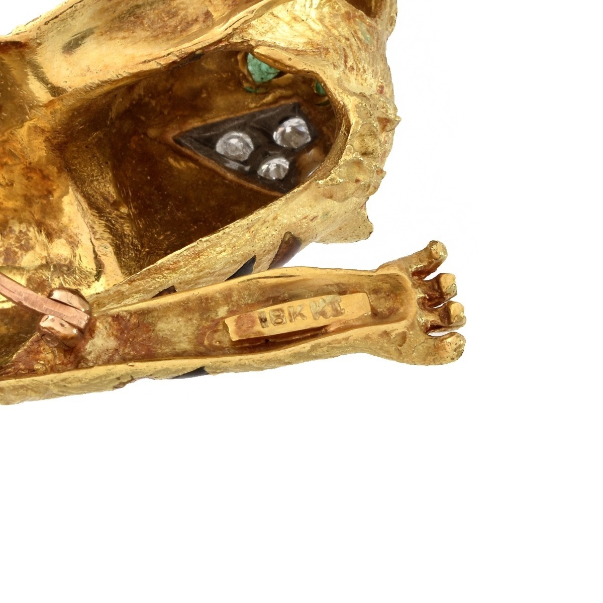 Vintage 18 Karat Yellow Gold Tiger Brooch Accented with Enamel, Small Round Cut Diamonds and Emerald Eyes. Stamped 18K. Measure 3" L, 1" W. Approx. weight: 36.94 grams. Condition: Good vintage condition. Small area of enamel loss to tail. For additional information and/or WhatsApp video please contact our resident GIA Graduate Gemologist, Russ Kodner at 954.650.5030 Estimate: $2000.00 - $3000.00 Domestic Shipping: $40.00