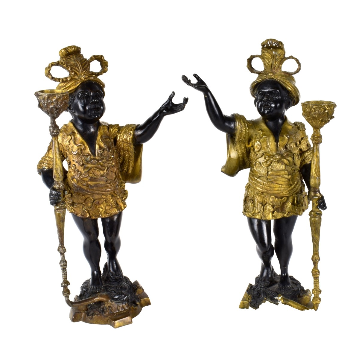 Pair Venetian Style Patinated Bronze Blackamoor Figural Candlesticks. Unsigned. Measures 15-3/4"H x 8"W. Condition: Good Condition Estimate: $200.00 - $300.00 Domestic Shipping: $95.00