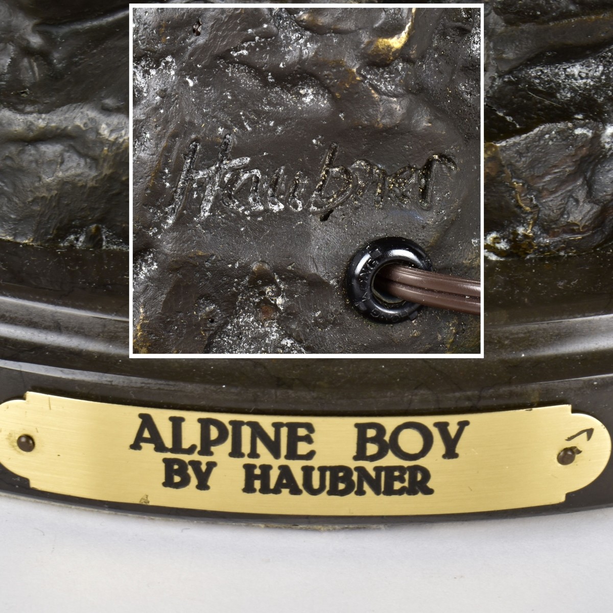 Haubner (20th Century) Bronze Sculpture on a Marble Base Presented as a Lamp "Alpine Boy" Signed. Overall measures 26-1/2" x 11". Condition: Good condition. Estimate: $250.00 - $500.00 Domestic Shipping: Third party
