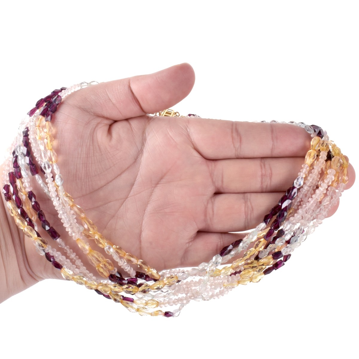 Multi-strand Gemstone Bead Necklace with 14 Karat Yellow Gold Clasp. Set with garnets, citrines, rock crystal and rose quartz. Clasp stamped 585. Measures 17-1/2" L. Approx. weight: 95.86 grams. Condition: Very good condition. Estimate: $300.00 - $500.00 Domestic Shipping: $34.00