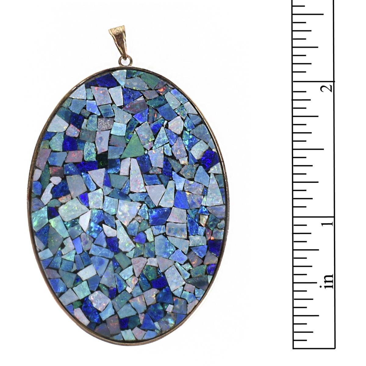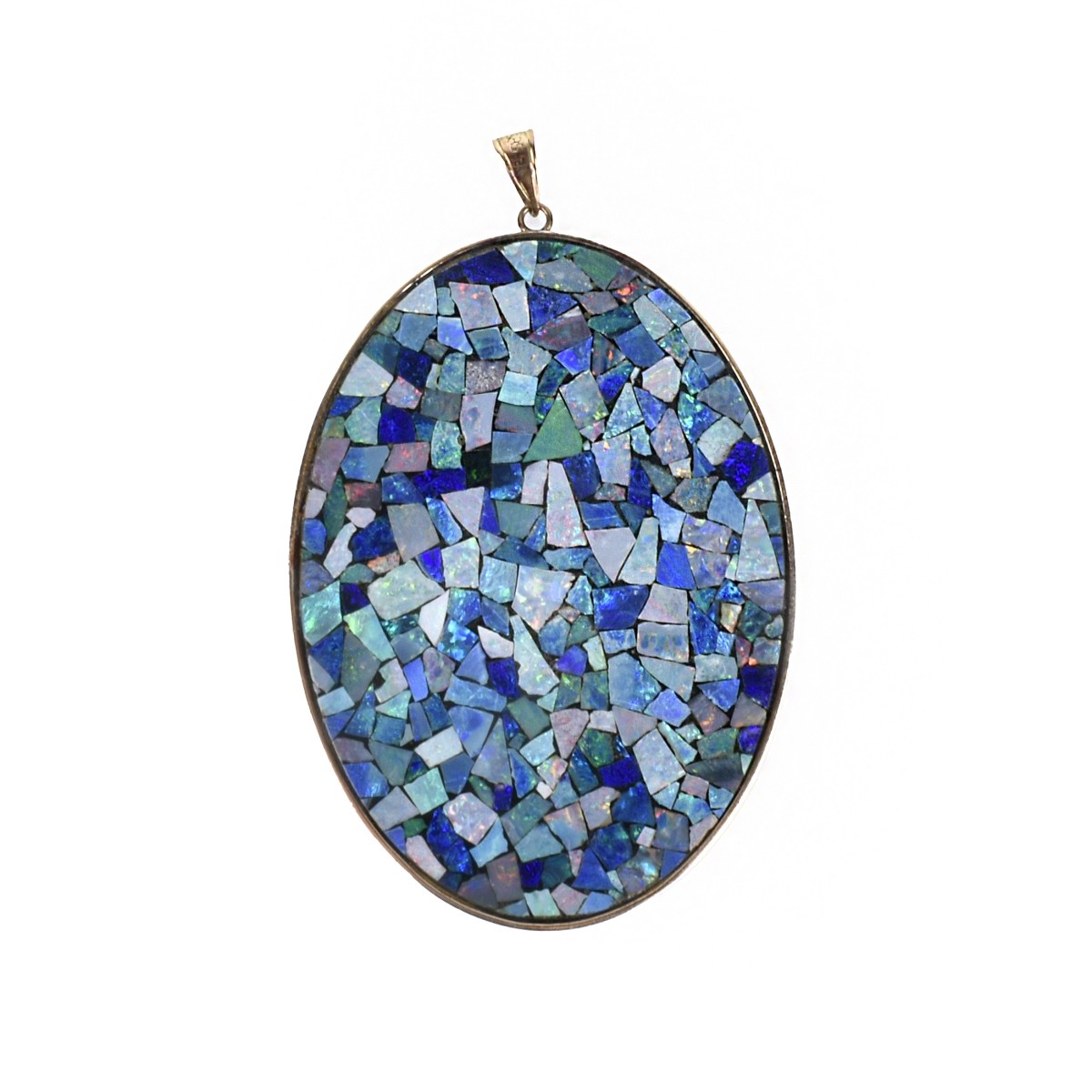 Vintage Micro Mosaic Black Opal and 14 Karat Yellow Gold Pendant. Opals with good play of color. Bale stamped 14K. Pendant measures 2-1/4" L, 1-5/8" W. Approx. weight: 13.58 grams. Condition: Very good vintage condition. For additional information and/or WhatsApp video please contact our resident GIA Graduate Gemologist, Russ Kodner at 954.650.5030 Estimate: $800.00 - $1200.00 Domestic Shipping: $40.00