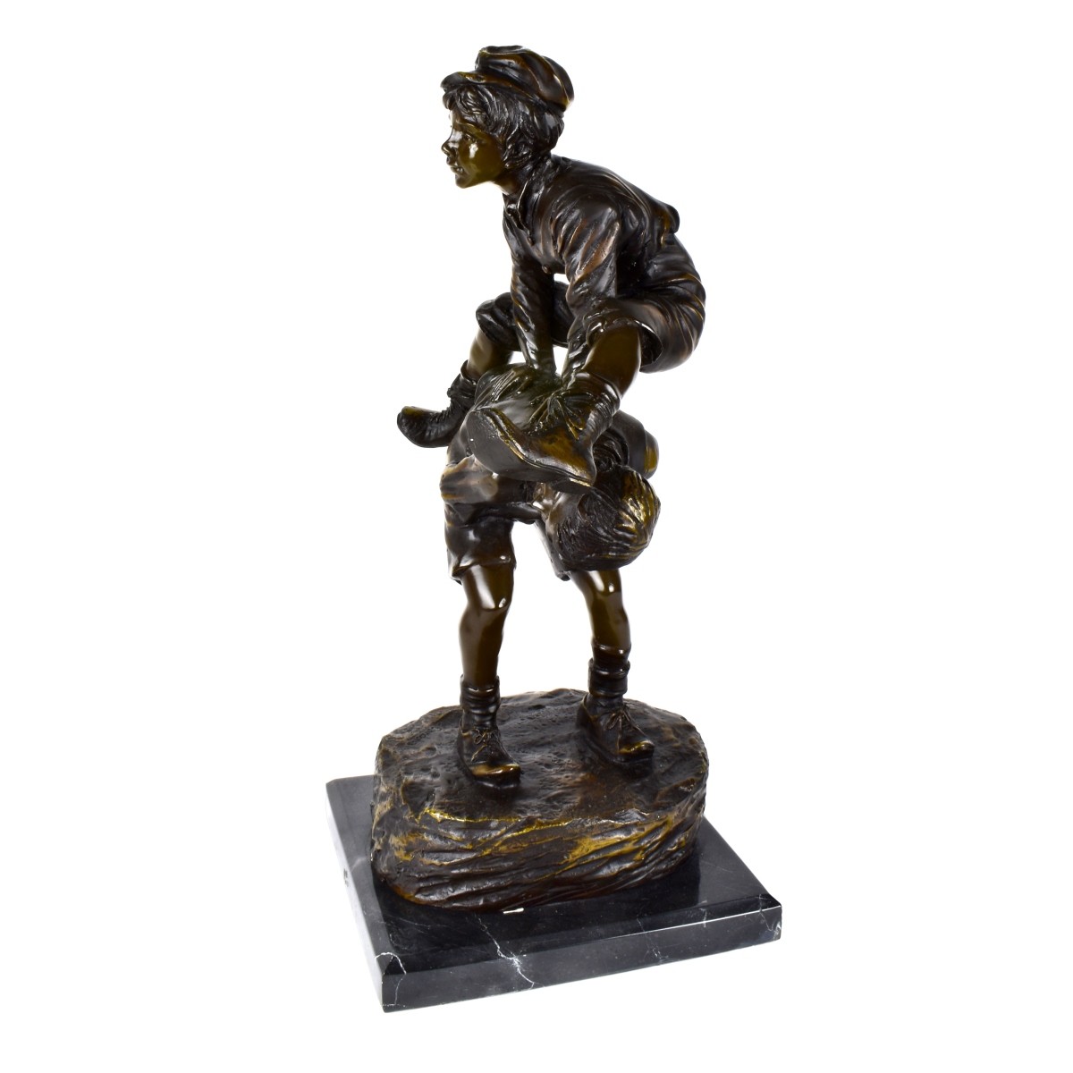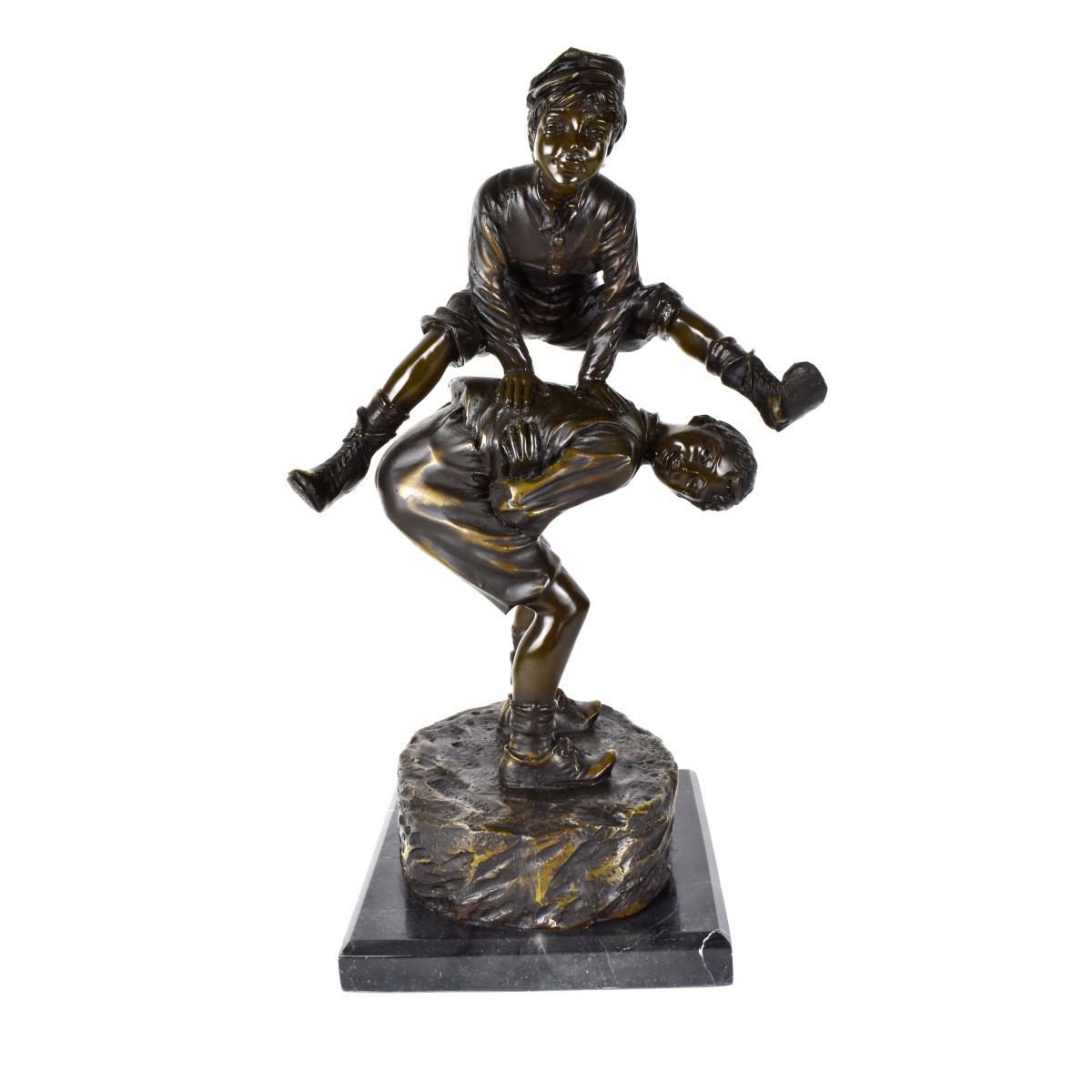 Jose Cardona Furro, Spanish (1878 - 1923) Bronze Sculpture on Marble Base "Two Boys Playing Leap Frog" Signed. Overall measures 24" x 14-1/4" x 11-1/4". Condition: Good condition. Estimate: $200.00 - $400.00 Domestic Shipping: Third party