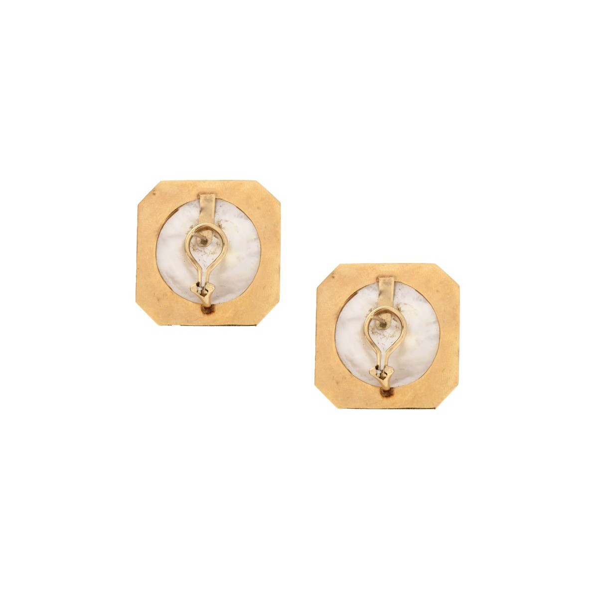 Large Mabe Pearl and 14 Karat Yellow Gold Earrings. Pearls with good luster and polish. Earrings measure 1-1/4" square. Approx. weight: 22.66 grams. Condition: Good vintage condition. Need cleaning. For additional information and/or WhatsApp video please contact our resident GIA Graduate Gemologist, Russ Kodner at 954.650.5030 Estimate: $600.00 - $800.00 Domestic Shipping: $40.00