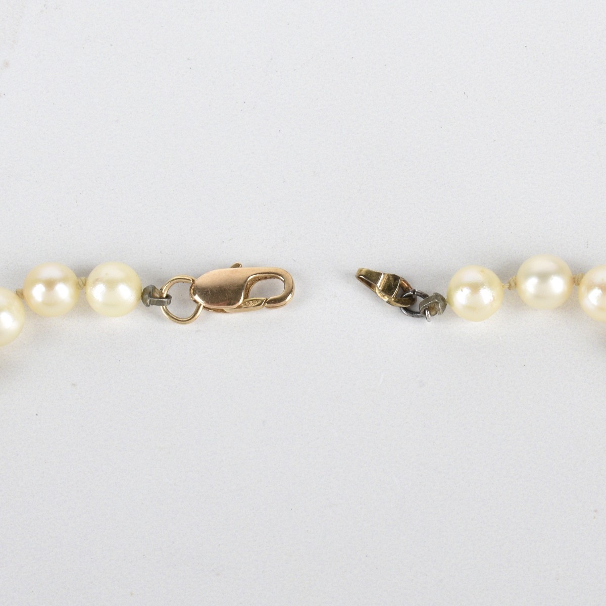 Vintage Single Strand 6.5mm Pearl Necklace with 14 Karat Yellow Gold Clasp and Detachable Mabe Pearl and 14 Karat Yellow Gold Pendant. Mabe pearl with good luster and polish, measures 15mm. Necklace measures 16-3/4" L; pendant measures 1" L, 3/4" W. Approx. total weight: 27.14 grams. Condition: Good vintage condition. Estimate: $200.00 - $400.00 Domestic Shipping: $40.00