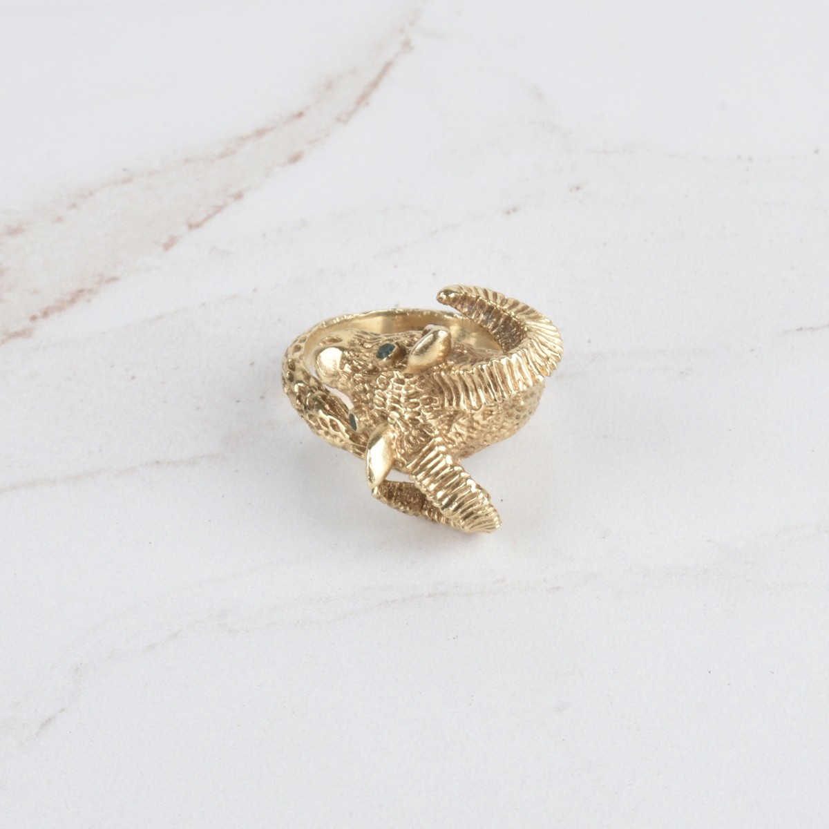 Vintage Heavy Textured 14 Karat Yellow Gold Ram's Head Ring accented with Emerald Eyes. Ring size 6-1/2. Approx. weight: 14.87 grams. Condition: Very good condition. Estimate: $600.00 - $800.00 Domestic Shipping: $40.00