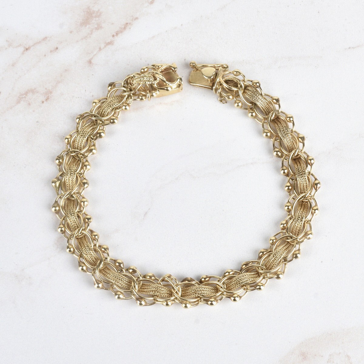 Vintage 14 Karat Yellow Gold Charm Bracelet. Clasp stamped 14K. Measures 7-1/2" L, 3/8" W. Approx. weight: 17.31 grams. Condition: Very good condition. Estimate: $600.00 - $800.00 Domestic Shipping: $40.00