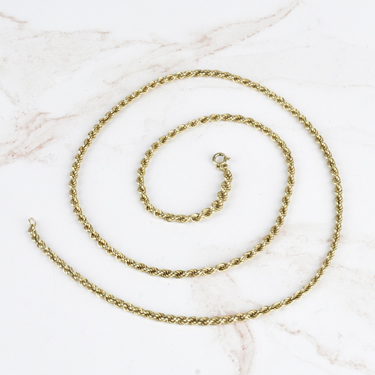 Vintage 14 Karat Yellow Gold Rope Link Necklace. Stamped 14K. Measures 27-1/2". Approx. weight: 12.51 grams. Condition: Very good vintage condition. Estimate: $500.00 - $700.00 Domestic Shipping: $40.00