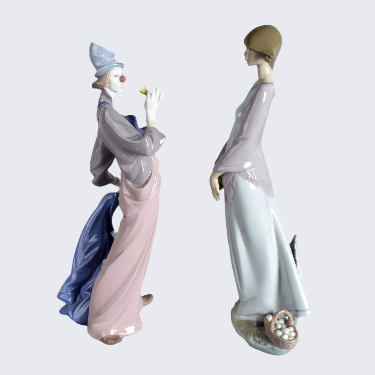 Grouping of Two Lladro Porcelain Figurines. Includes: "A Mile Of Style" and "On The Farm". Each signed and numbered on the base. Tallest measures 14-1/4" x 6-3/8". Remaining figurine measures 13-3/4" x 6". Condition: Good condition. Estimate: $150.00 - $350.00 Domestic Shipping: Third party