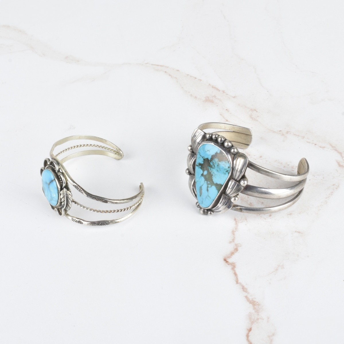 Two Vintage American Southwest Turquoise and Silver Cuff Bangle Bracelets. Unsigned. Larger measures 5" interior circumference with 1-1/4" opening, 1-3/4" W. Approx. total weight: 56.20 grams. Condition: Good vintage condition. Estimate: $100.00 - $200.00 Domestic Shipping: $40.00