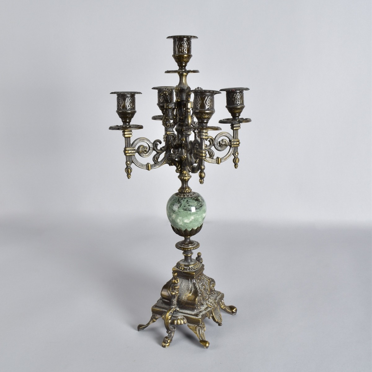 Pair Antique Style Five Light Bronze Candelabra with Green Marble and bird accent. Measures 17" H x 8-1/4"W Condition: Good Condition. One foot is slightly bent on one. One light is slightly bent. Estimate: $100.00 - $200.00 Domestic Shipping: Third Party