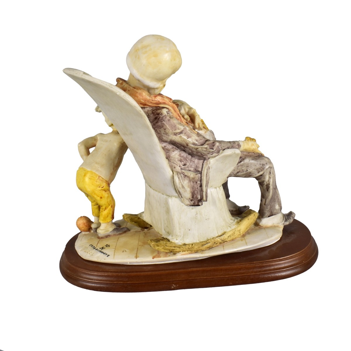 Vintage Capodimonte Porcelain Figurine of a Grandpa and Child Presented on a Wooden Base. Factory mark and artist signed. Overall measures 9-5/8" x 11" x 5-1/2". Condition: Good condition. Estimate: $100.00 - $200.00 Domestic Shipping: Third party