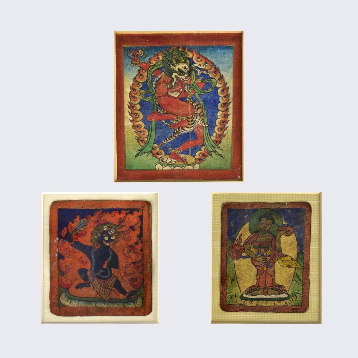 Grouping of Three Framed Antique Tibetan Buddhist Miniature Paintings. Largest frame measures 8-1/2" x 7-1/4". Smallest measures 8-1/4" x 6-3/4". Condition: Good condition. Estimate: $100.00 - $300.00 Domestic Shipping: $62.00