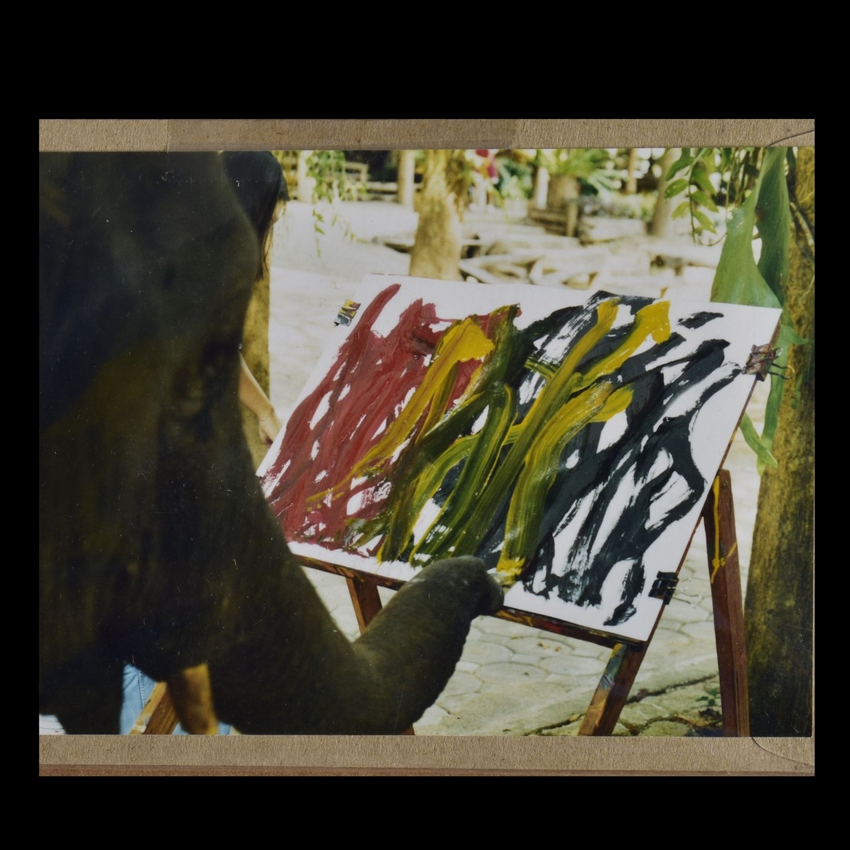 Thailand Art Academy Oil on Canson Fineface Paper Painting by Elephant "Abstract Composition" Watermarked and The Golden Triangle Label affixed En Verso. Lot is accompanied with photos. Unframed. Sheet measures 30" x 22-1//8". Condition: Good condition. Estimate: $50.00 - $150.00 Domestic Shipping: $125.00