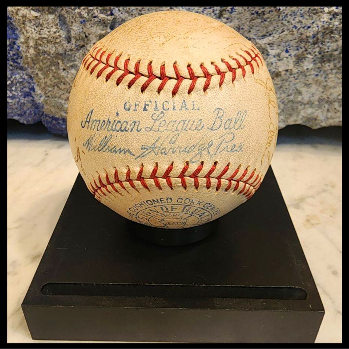 1929 New York Yankees Team Signed Baseball. Official American League baseball signed by the twenty-three members of the team including Babe Ruth, Lou Gehrig and others. Condition: Good condition. Estimate: $15,000.00 - $25,000.00 Domestic Shipping: $48.00