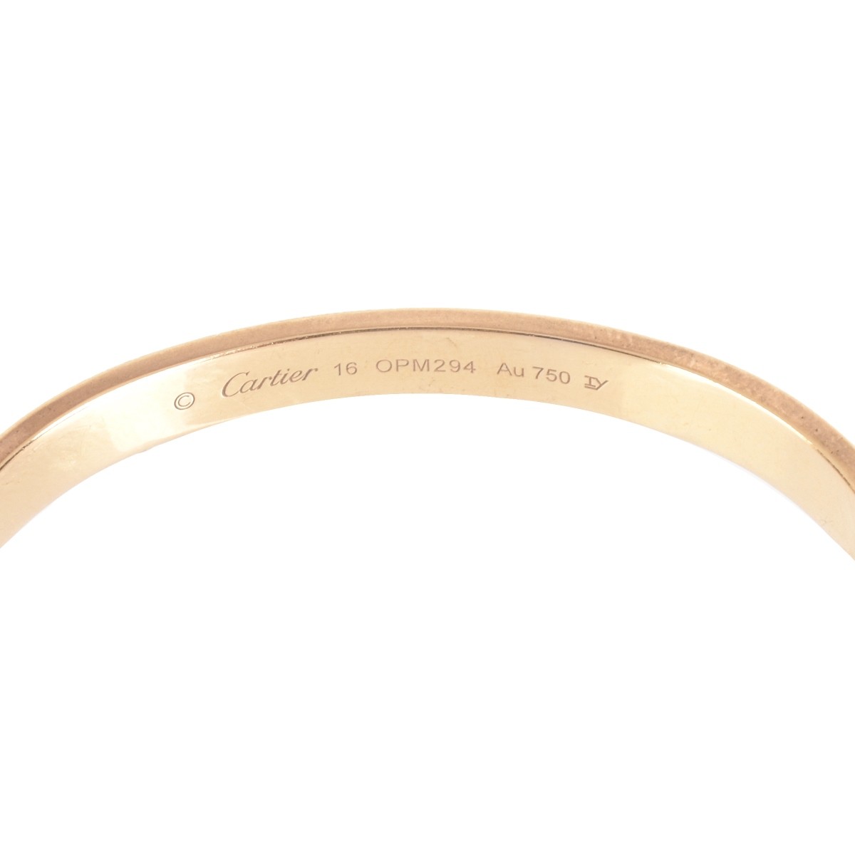 Cartier 18 Karat Pink Gold Love Bracelet. Signed, stamped 750. Size 16. Approx. weight: 29.59 grams. With box, papers and screwdriver. Condition: Very good condition. For additional information and/or WhatsApp video please contact our resident GIA Graduate Gemologist, Russ Kodner at 954.650.5030 Estimate: $3000.00 - $5000.00 Domestic Shipping: $40.00