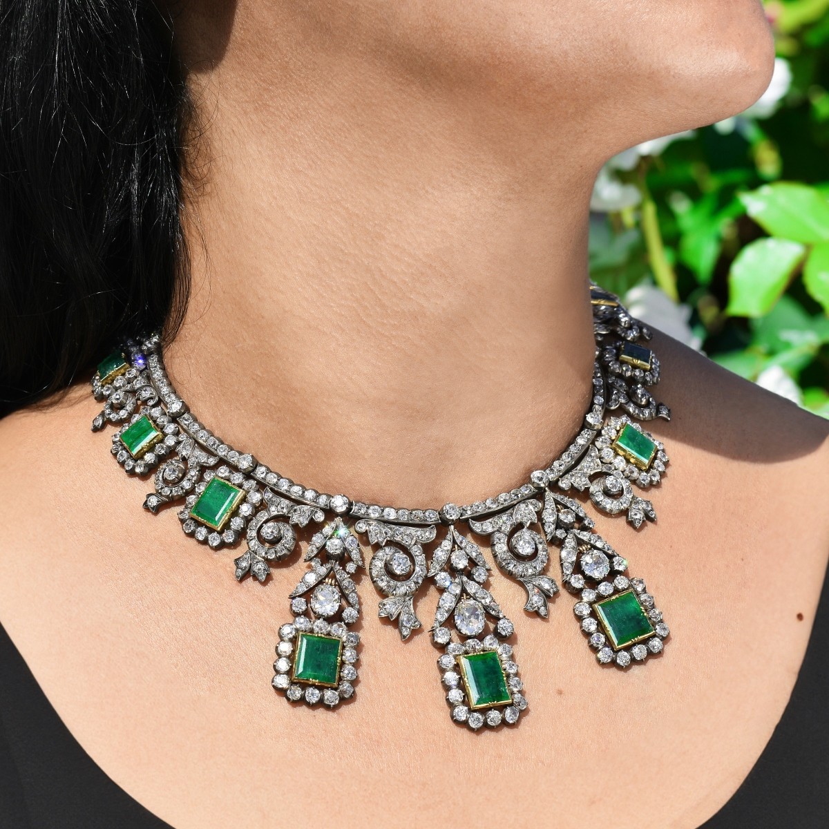 Important Antique Victorian Approx. 110.0 Carat TW Six Hundred Eighty Four Old MIne Cut Diamond, 50.0 Carat TW Twelve Emeralds, 18 Karat Yellow Gold and Silver Topped Necklace. The three largest diamonds weigh approx. 7.0 carats TW. Diamonds G-I color, VS1-VS2 clarity. Emeralds with good color. Measures 18" L. Approx. weight: 164.5 grams. Condition: Very good antique condition. For additional information and/or WhatsApp video please contact our resident GIA Graduate Gemologist, Russ Kodner at 954.650.5030 Estimate: $150,000.00 - $180,000.00 Domestic Shipping: $48.00