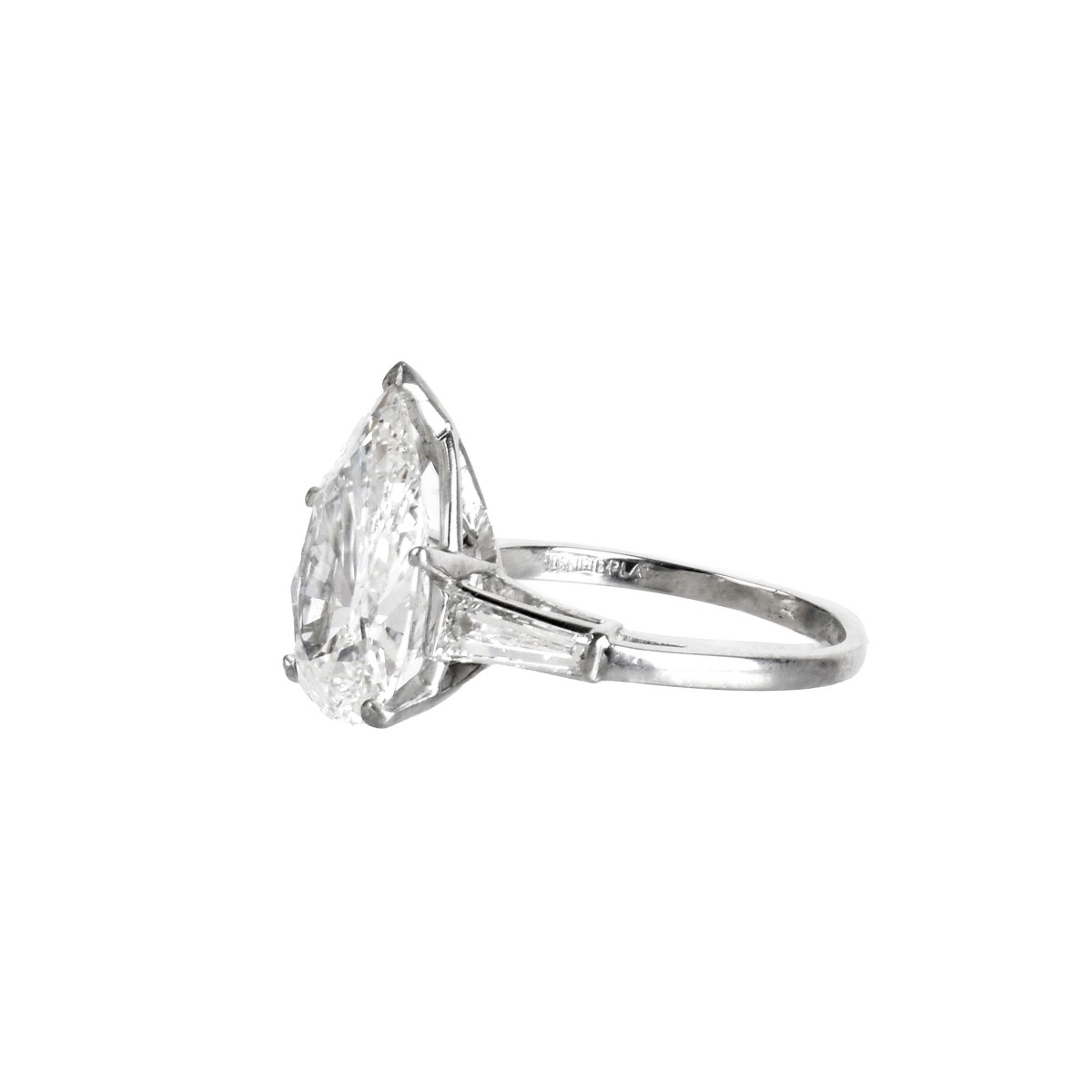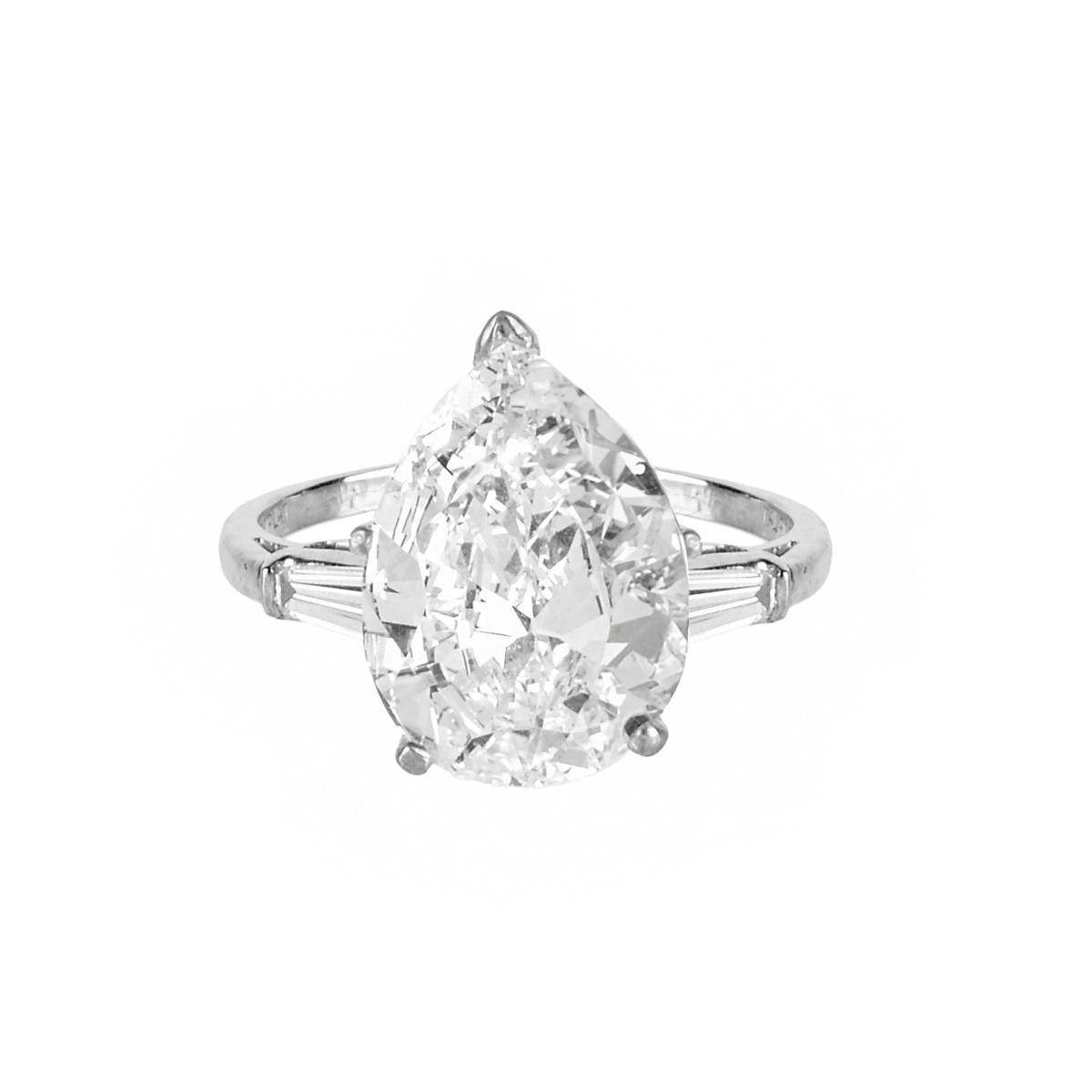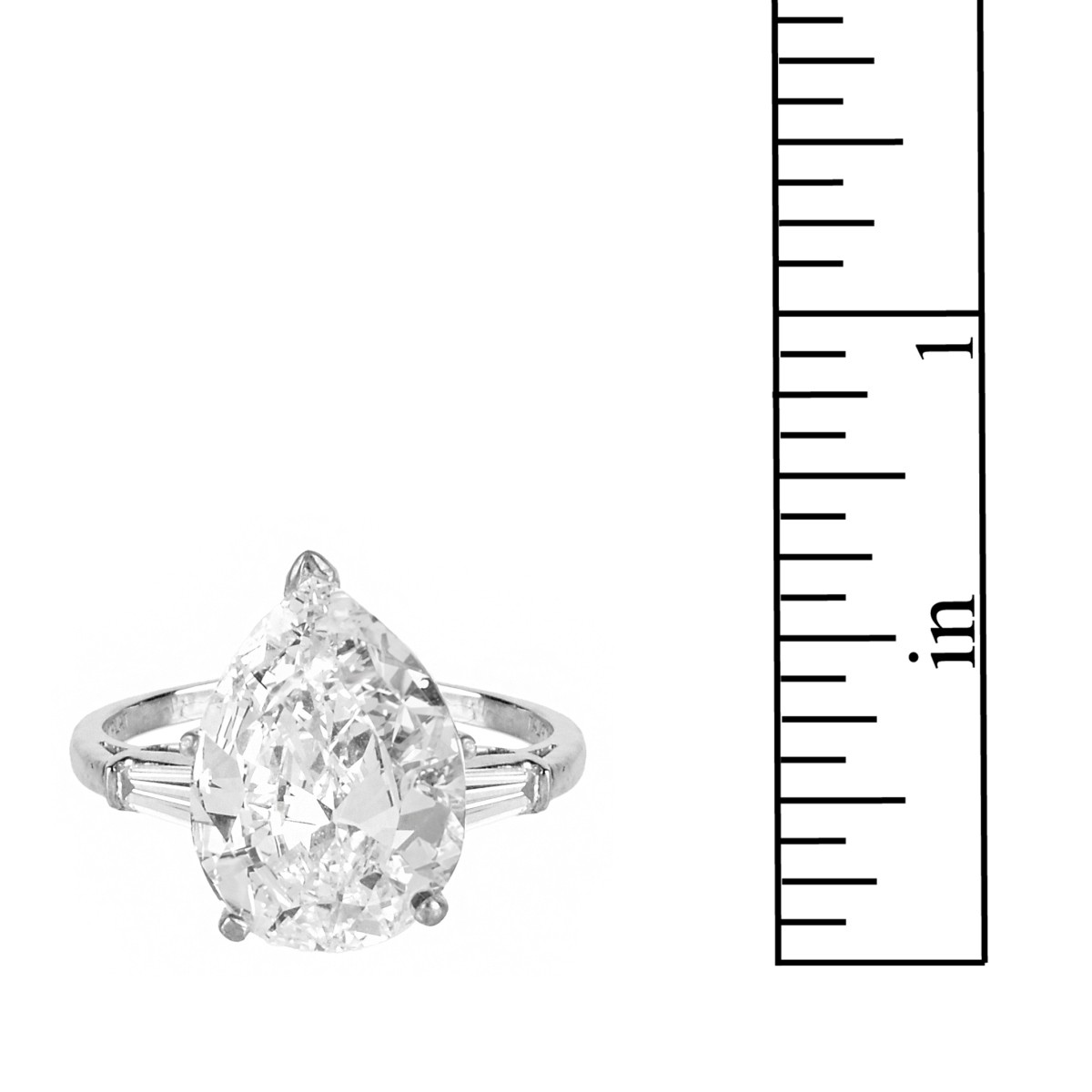 GIA Certified 5.93 Carat Pear Brilliant Cut Diamond and Platinum Engagement Ring. Accented with .80 carat TW two tapered baguette cut diamonds. Center diamond H color, VS2 clarity. Accent diamonds G-H color, VVS-VS clarity. Stamped Plat. Ring size 7-1/2. Approx. weight: 6.0 grams. GIA Report 2221938765 dated 5/15/2023 to accompany this Lot. Condition: Very good condition. Please refer to GIA report. For additional information and/or WhatsApp video please contact our resident GIA Graduate Gemologist, Russ Kodner at 954.650.5030 Estimate: $100,000.00 - $120,000.00 Domestic Shipping: $40.00
