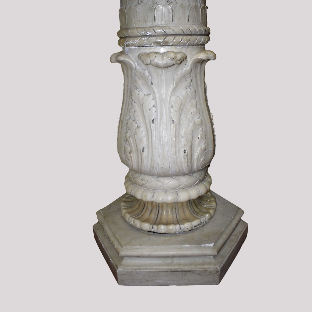 Pair of Grand Scale Early 20th Century Byzantine-style Carved Marble Architectural Columns with all-over Oak Leaf and Acorn Design. Measure (five sections): 8'4" H, 26" W (at top), 23" W (at base). Condition: Overall good antique condition with minor chips and losses to marble. Estimate: $7000.00 - $15,000.00 Domestic Shipping: Third party