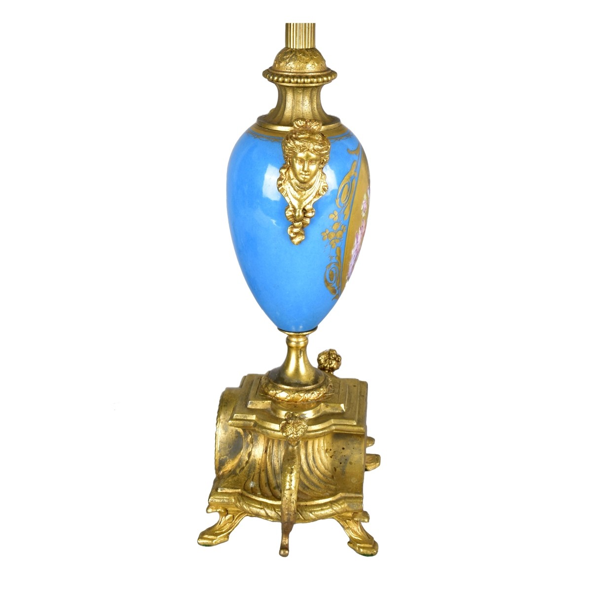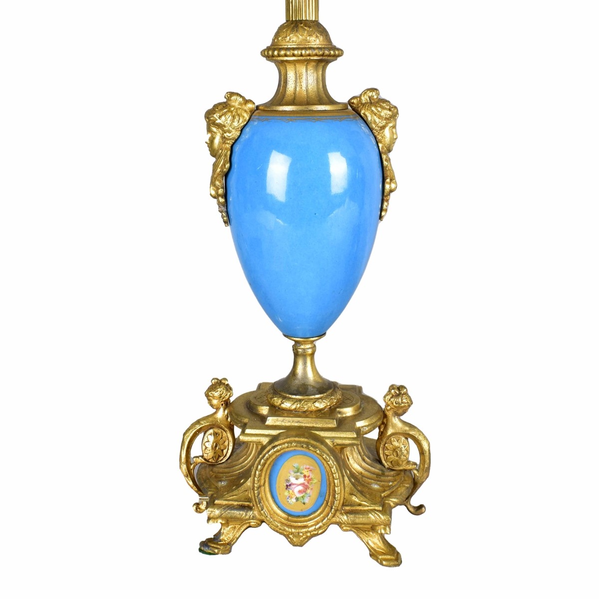 Pair of Antique Sevres Hand Painted and Ormolu Mounted Table Lamps with Mask Face Handles. Features a cherub scene with floral still life vignette. Overall height: 23-1/2" H, 6-1/4" W x 5-3/4" D. Condition: Good condition. Estimate: $400.00 - $600.00 Domestic Shipping: Third party