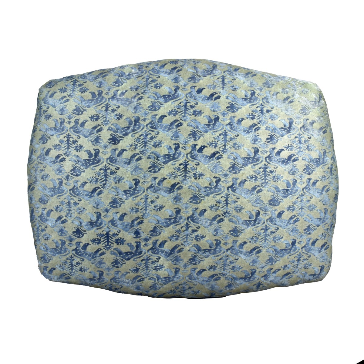 Antique Italian Rococo Finely Carved and Giltwood Tabouret. Custom upholstery in Fortuny "Richelieu" cobalt fabric with nail head trim. Measures 18" H, 20-1/2" W, 15-1/2" D. Condition: Very good antique condition. Minor nicks to gilt surface consistent with age and normal use. Estimate: $600.00 - $1000.00 Domestic Shipping: Third party