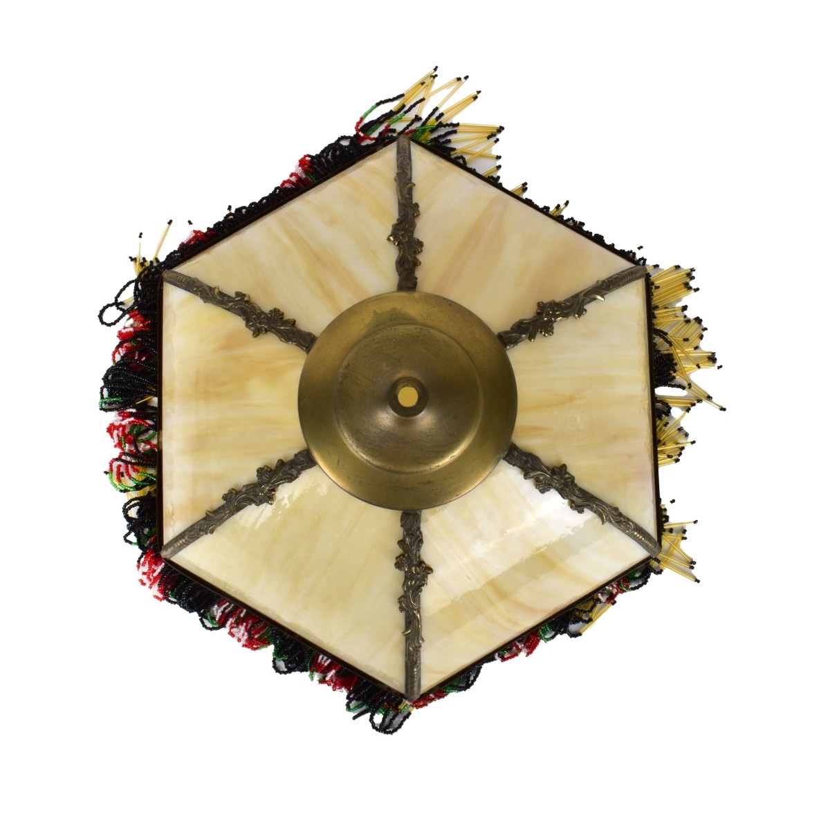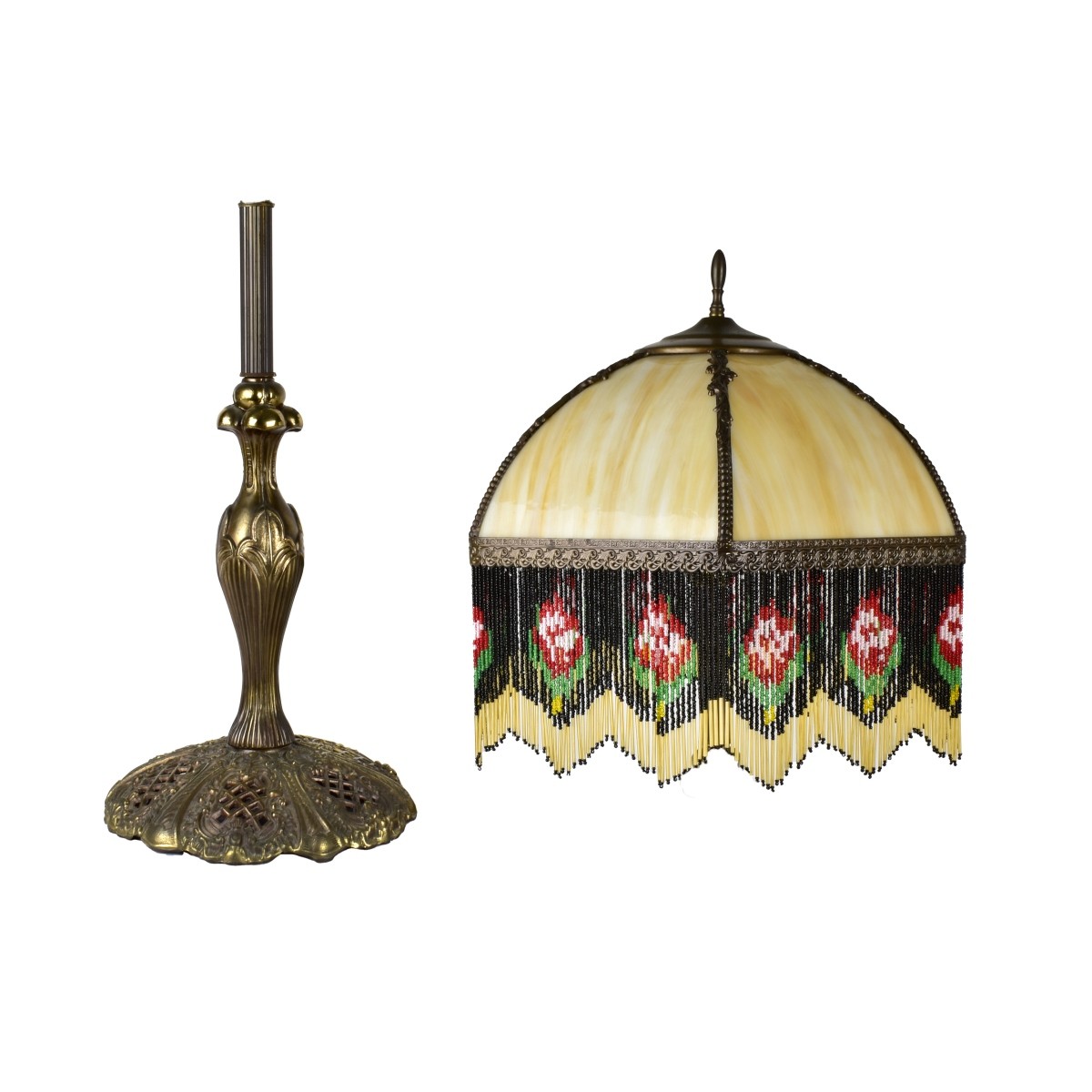 Antique Slag Glass Lamp with Hanging Beads Presented on a Louis XVI Style Metal Base. Overall measures 30" x 17". Condition: Good condition. Estimate: $200.00 - $300.00 Domestic Shipping: Third party